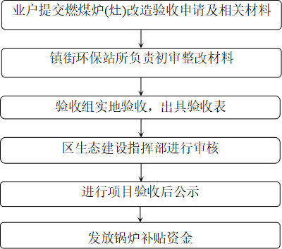 (二)区政府将组织有关部门成立专门验收组,对已经拆除原燃煤炉(灶)并提交燃煤炉(灶)改造验收申请的业户进行现场检查验收,合格后出具燃煤炉(灶)改造竣工验收表(见附件1)和燃煤炉(灶)改造以奖代补资金明细汇总表(见附件2)。