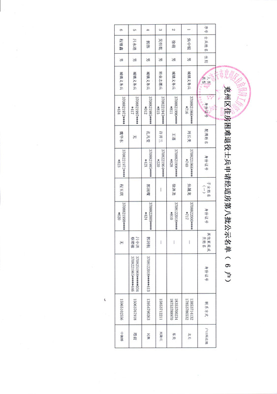 兖州区住房困难退役士兵第八批退役士兵申请经适房入户调查小组由区民政、各镇街、住房保障等人员组成。经过实地考察申购家庭住房、经济状况,现将认定符合条件的焦中银等6户退役士兵名单公示如下(详见附件1)。