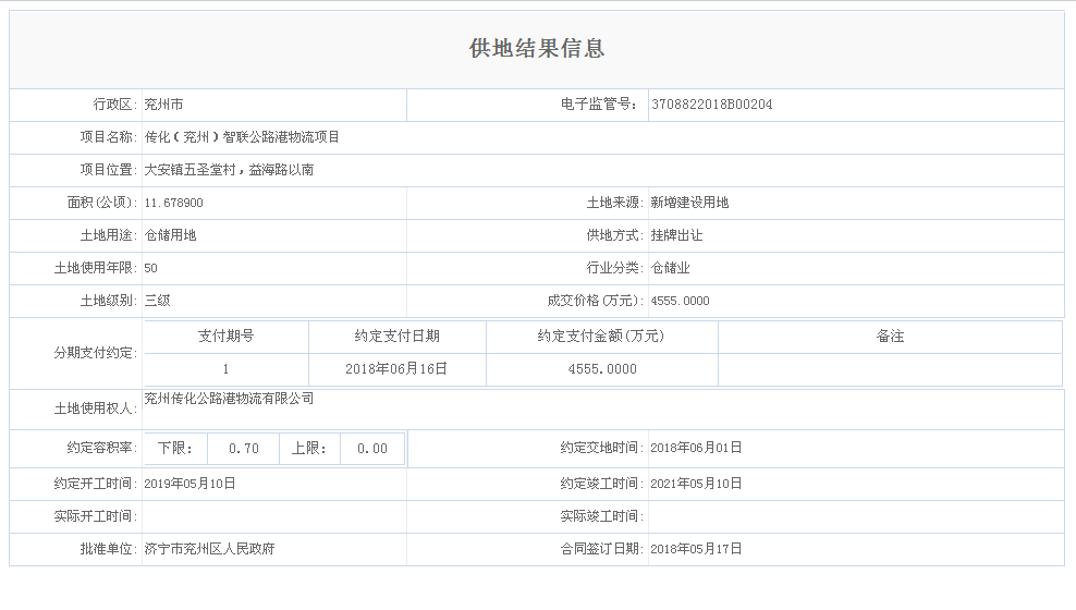 3708822018B00204传化(兖州)智联公路港物流项目供地结果信息