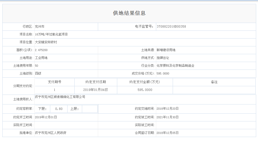 3708822018B00358 18万吨年过氧化氢项目供地结果信息