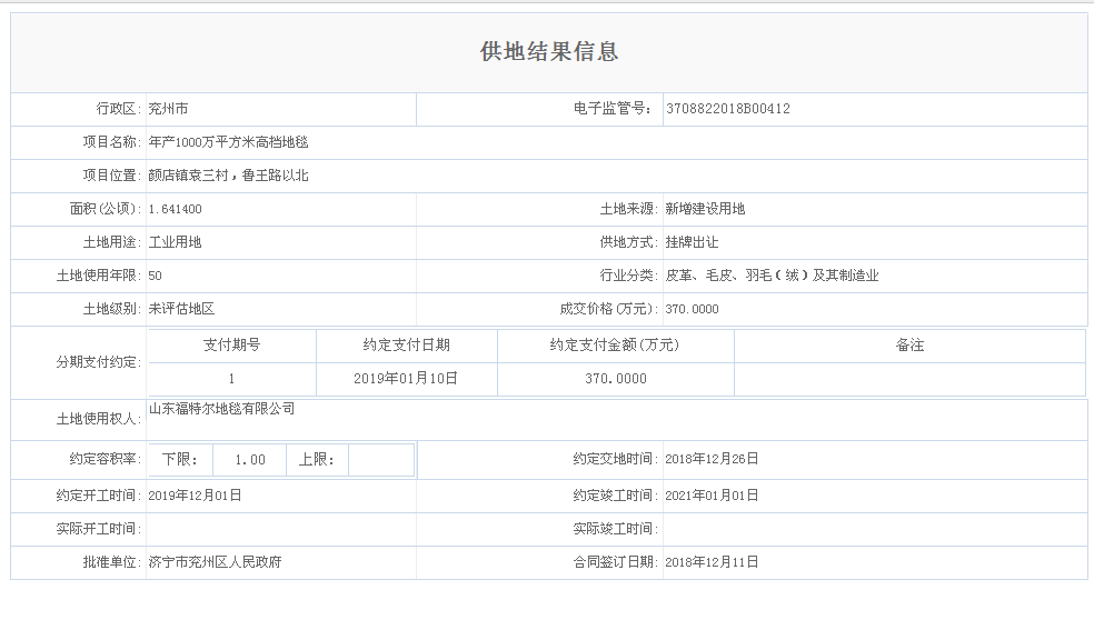 3708822018B00412年产1000万平方米高档地毯供地结果信息
