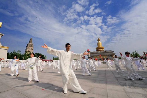 5月19日,兖州兴隆文化园内,来自全区的500余名太极爱好者,伴随着舒缓柔和的音乐,队列整齐、身着统一练功服表演了24式太极拳,场面壮大,吸引了