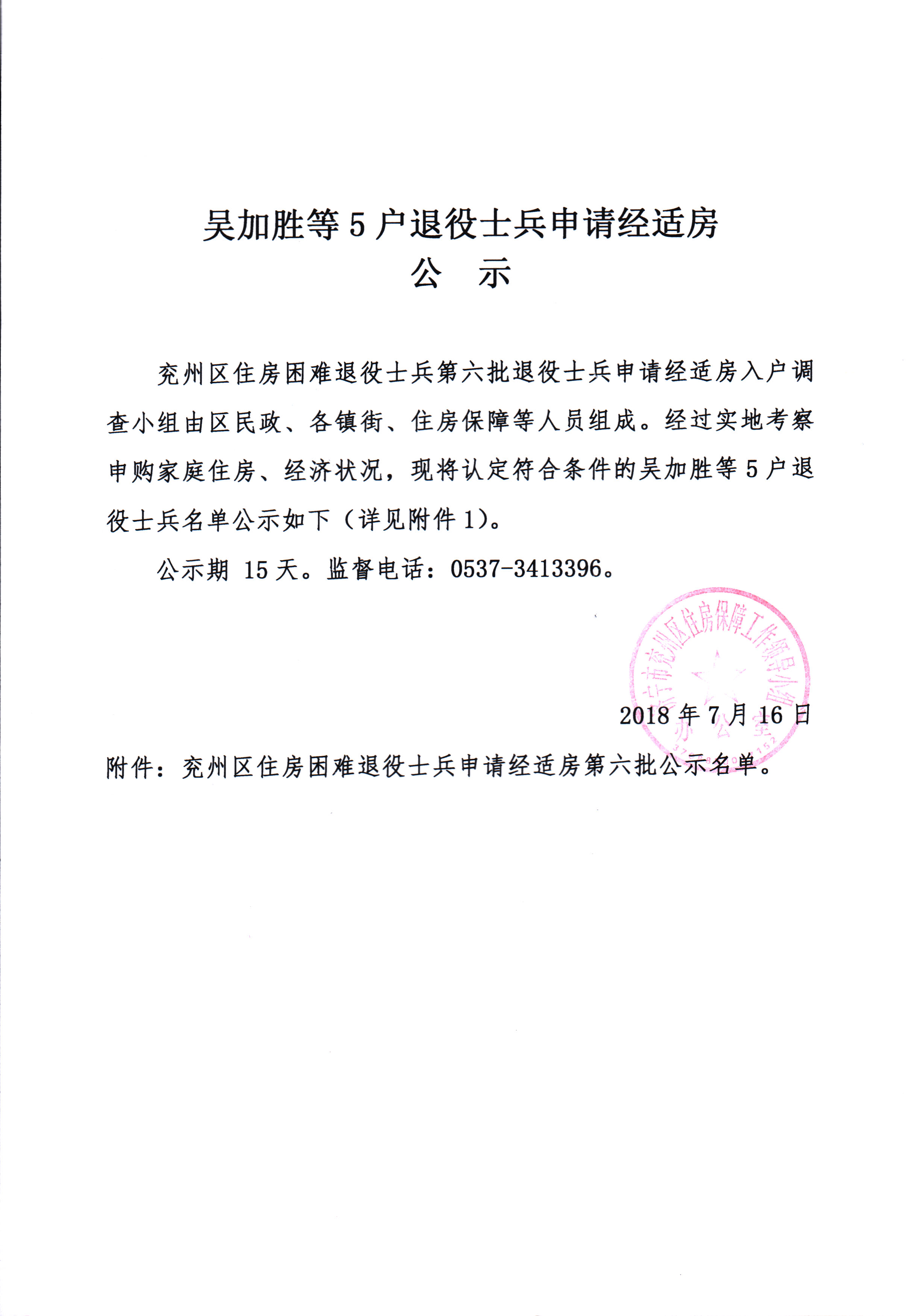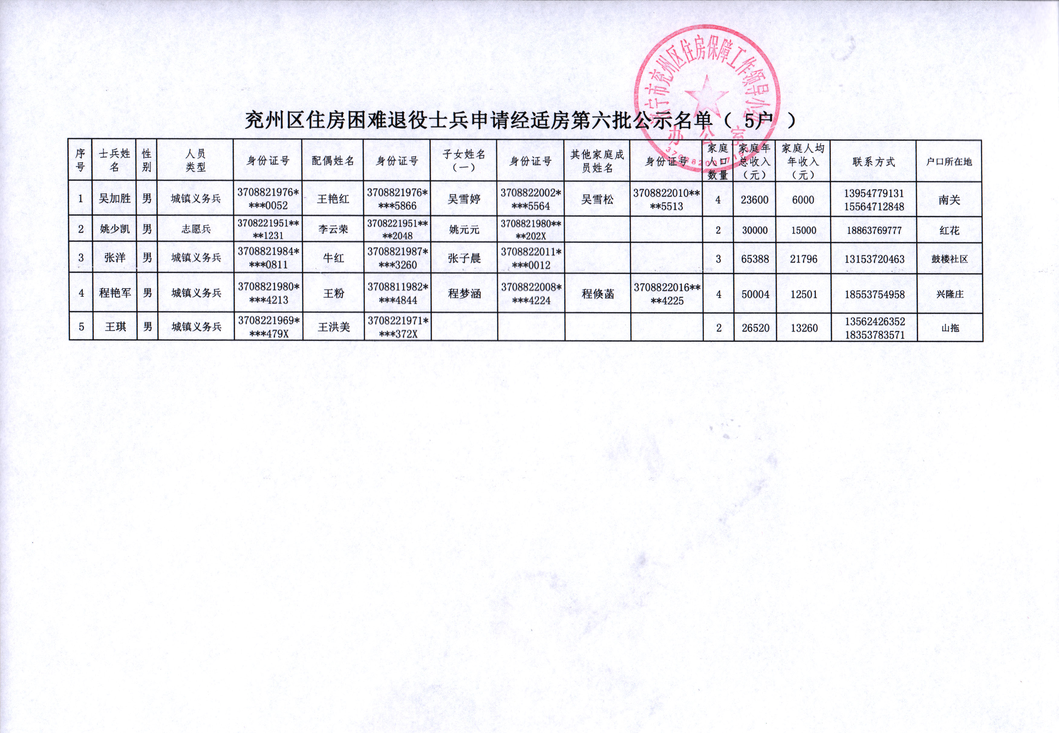 吴加胜等5户退役士兵申请经适房公示