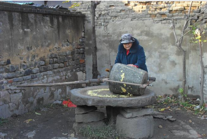 以前的碾盘使用率非常高,几乎要排队使用,碾盘必须与石磙配套,才能使用。石磙分两个用途,一是用在地面上,用来把粮食从整棵植物上碾下来,一是用在碾盘上碾碎收获的粮食。碾碎、压扁以备打成面或直接下锅食用。因为用得多碾盘四周形成了一圈硬地,白白的格外醒目,即使是下了雨,那硬地也不会出现“和稀泥”的场面。