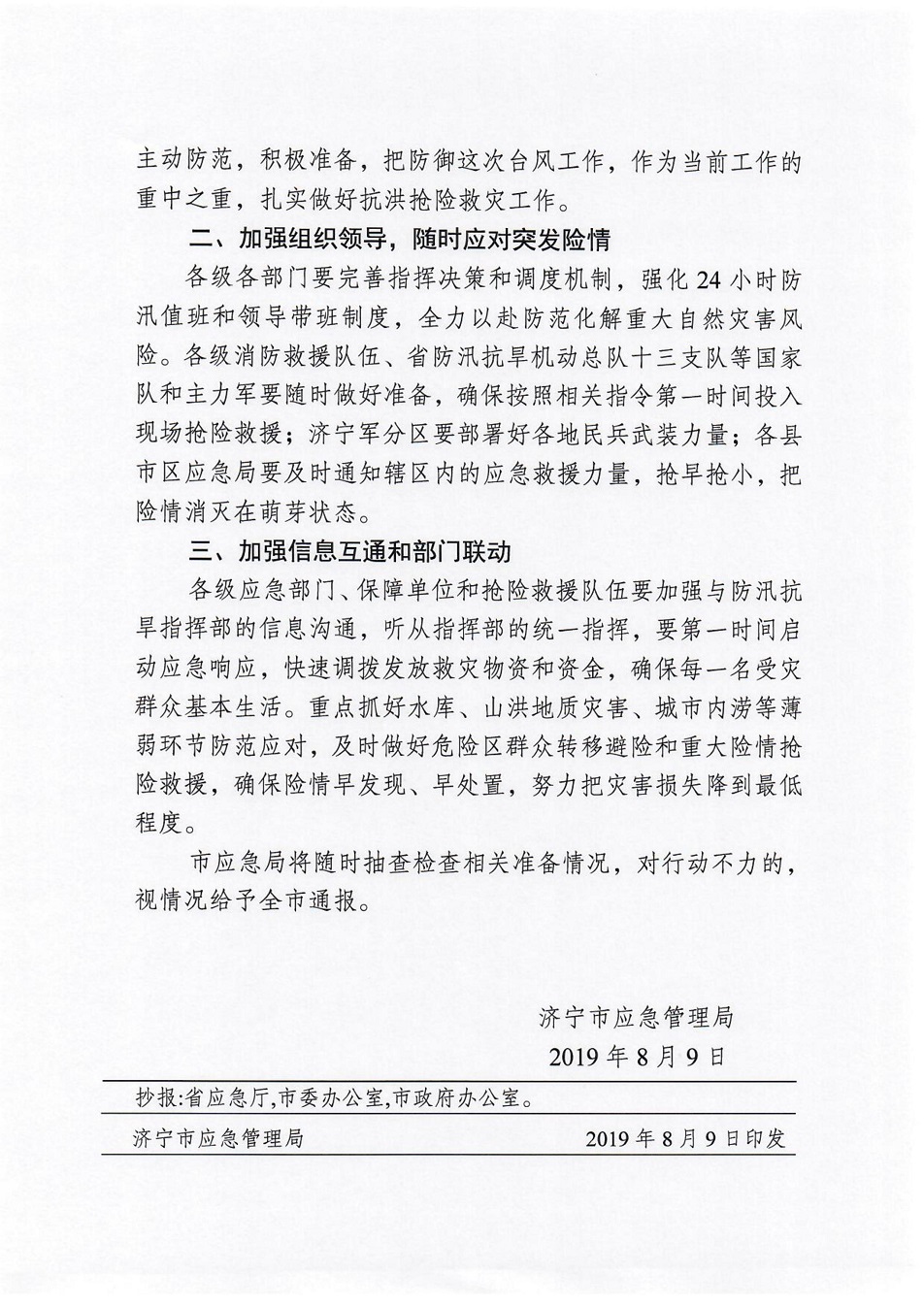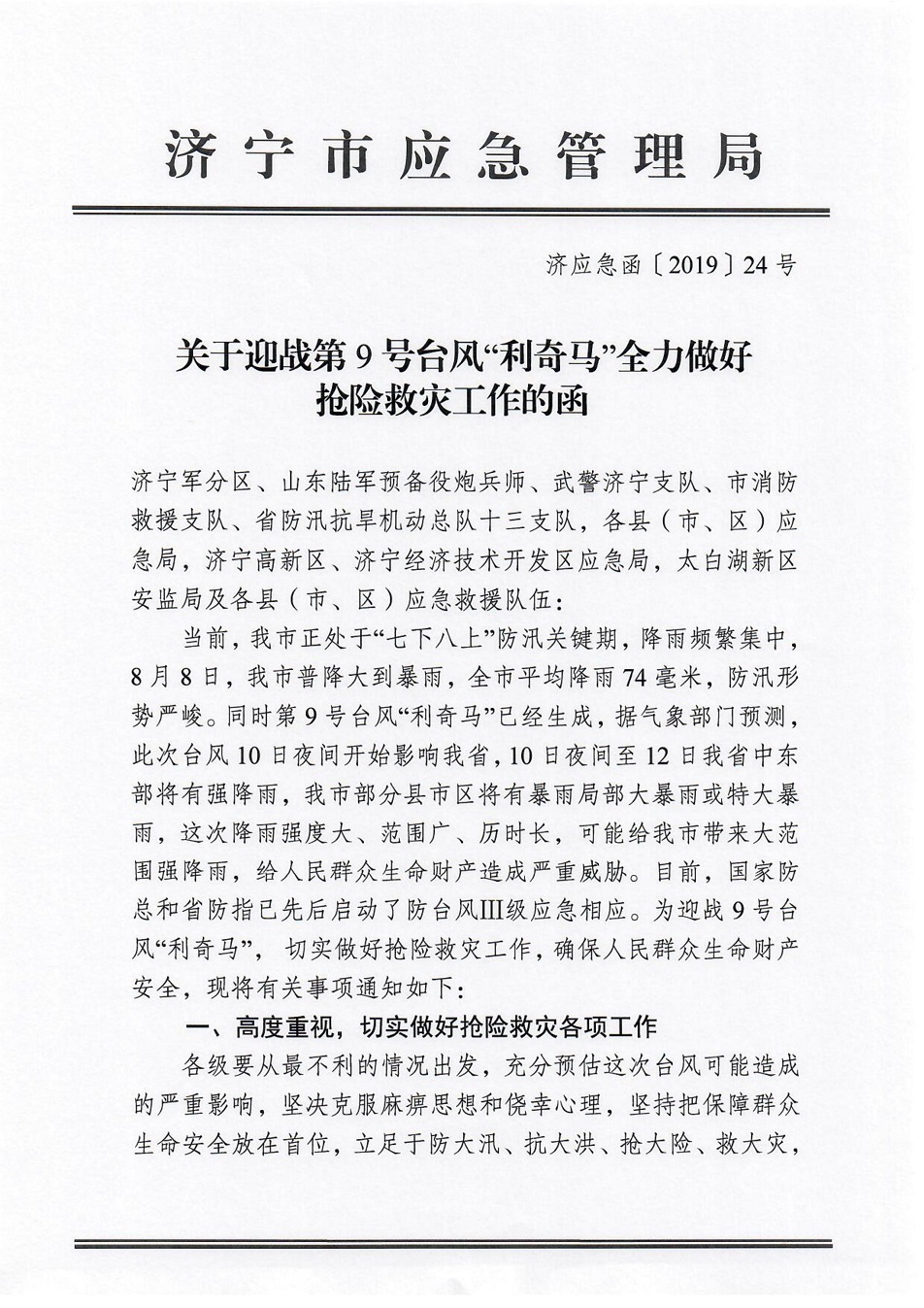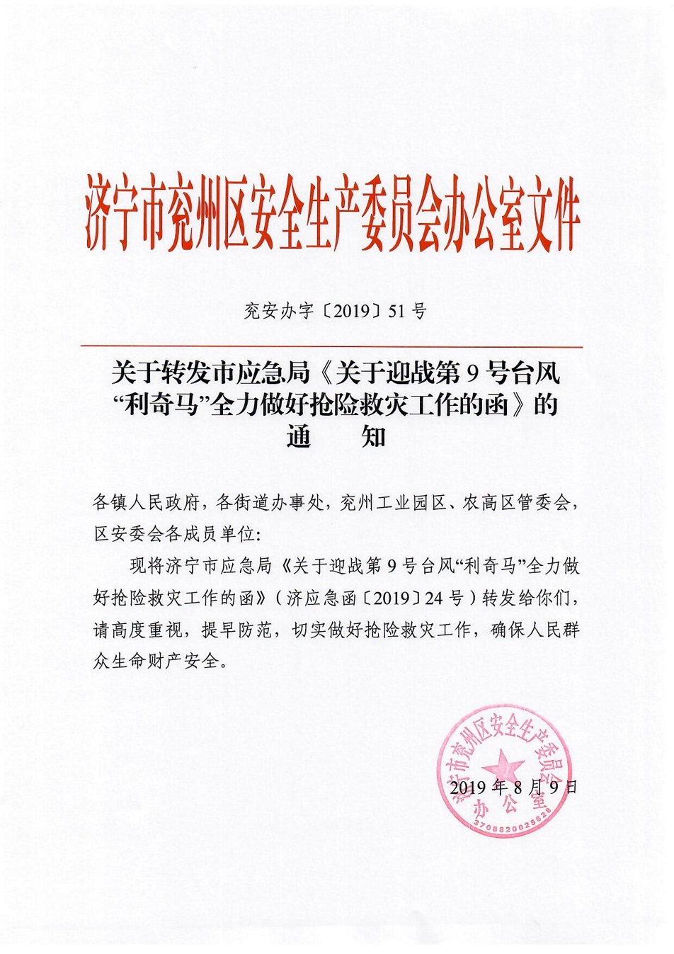 关于迎战第9号台风“利奇马”全力做好抢险救灾工作的通知