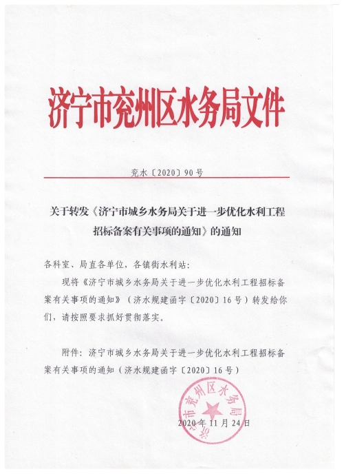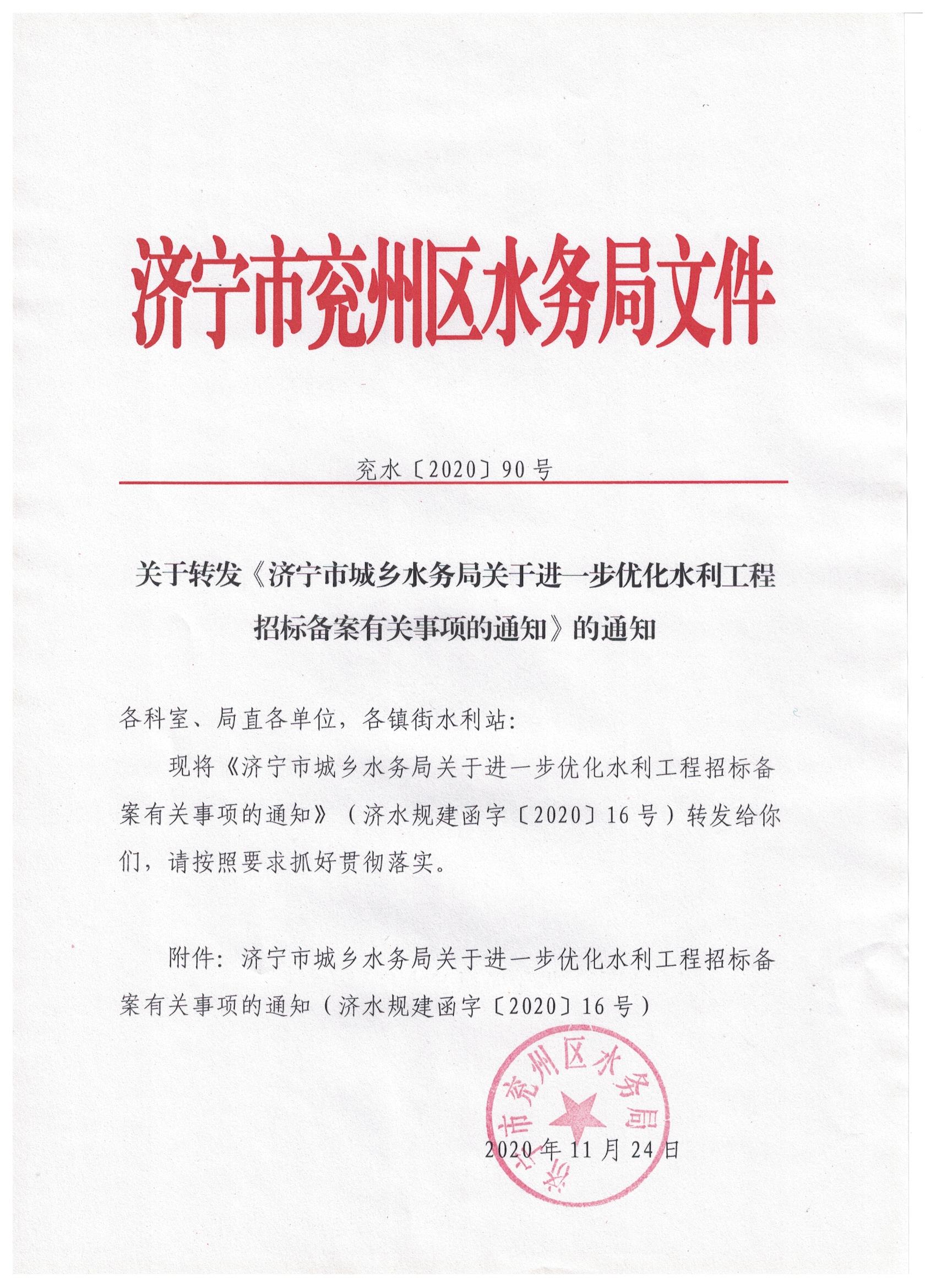 关于转发《济宁市城乡水务局关于进一步优化水利工程招标备案有关事项的通知》的通知