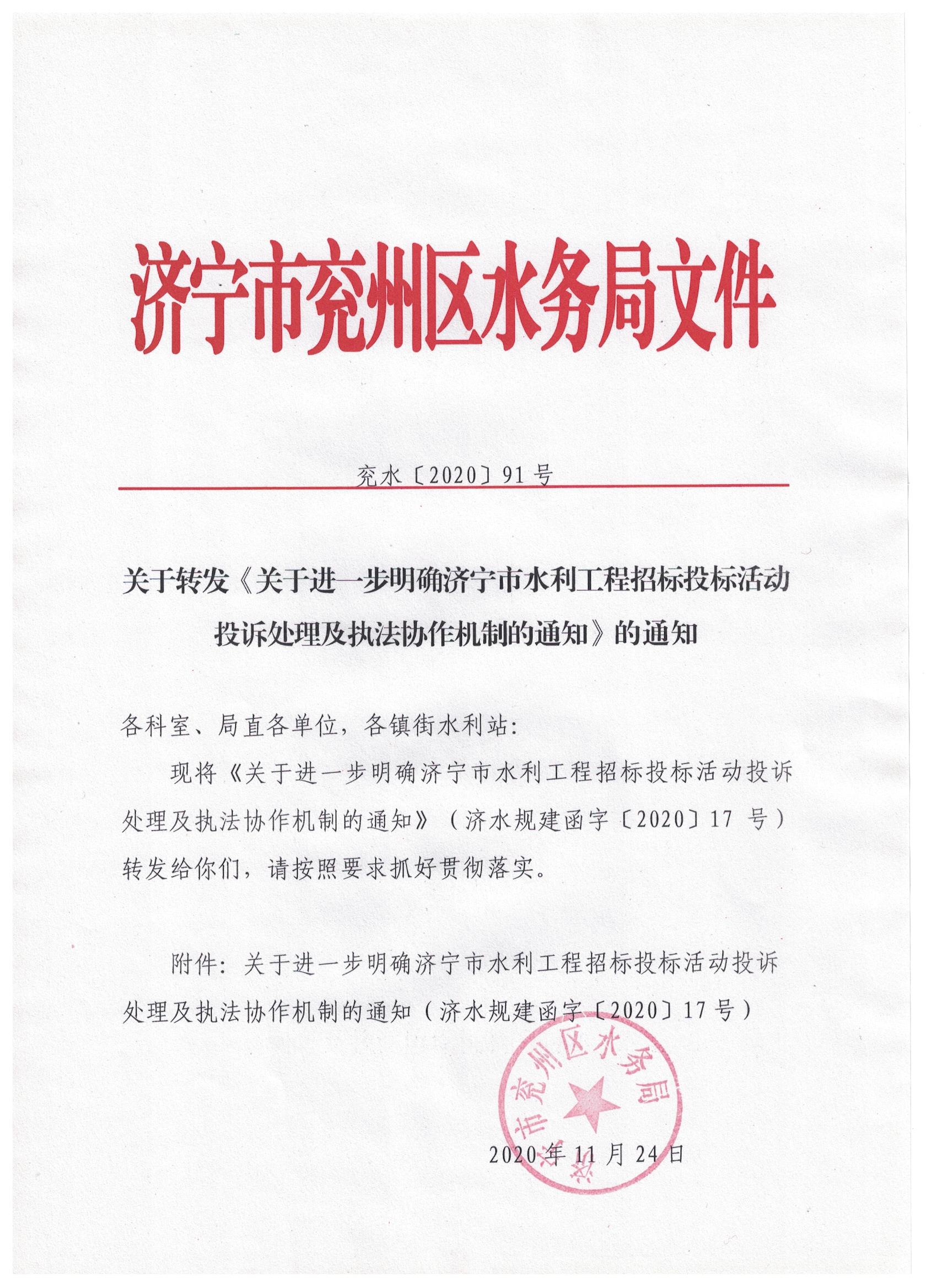 关于转发《关于进一步明确济宁市水利工程招标投标活动投诉处理及执法协作机制的通知》的通知