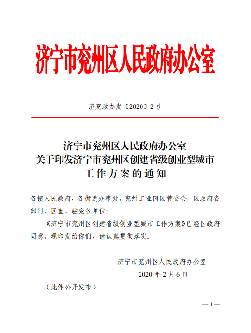 【PDF版下载】济宁市兖州区人民政府办公室关于印发济宁市兖州区创建省级创业型城市工作方案的通知