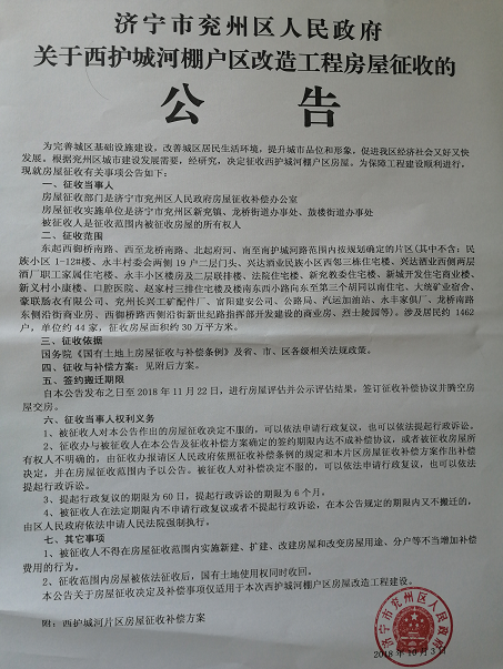济宁市兖州区人民政府关于西护城河棚户区改造工程房屋征收的公告