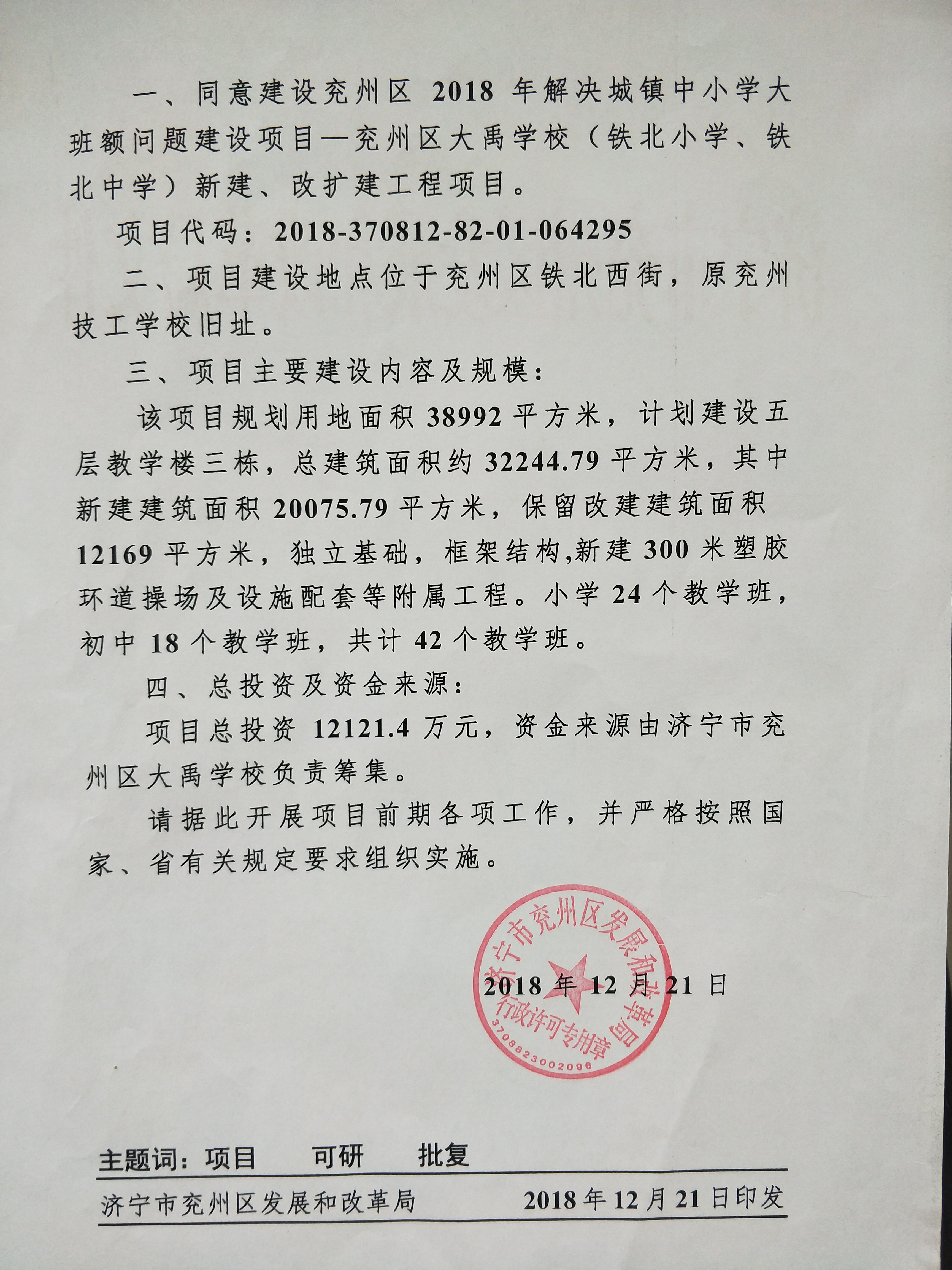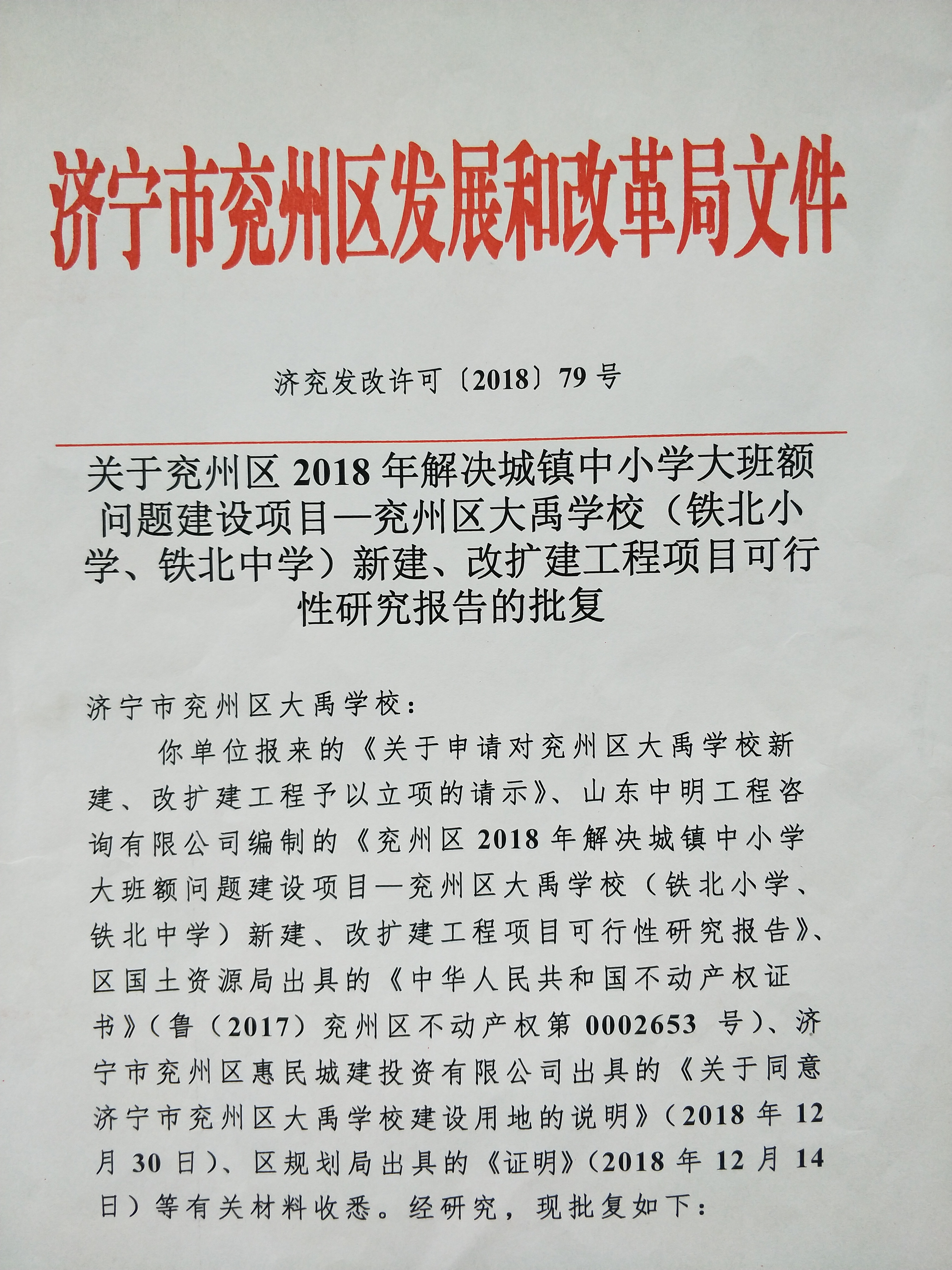 【兖州区大禹学校新建、改扩建工程项目】可研批复