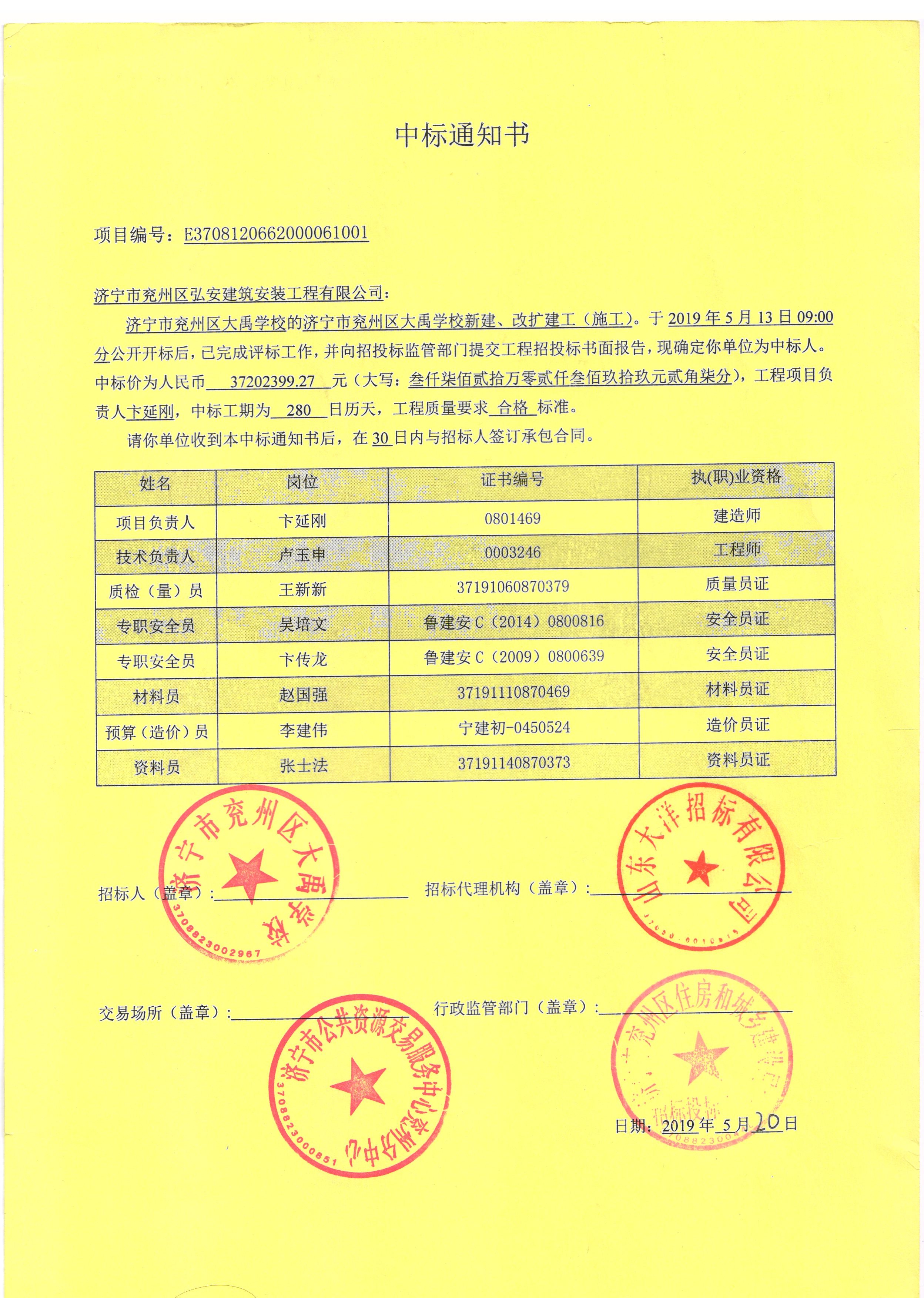【兖州区大禹学校新建、改扩建工程项目】中标通知书