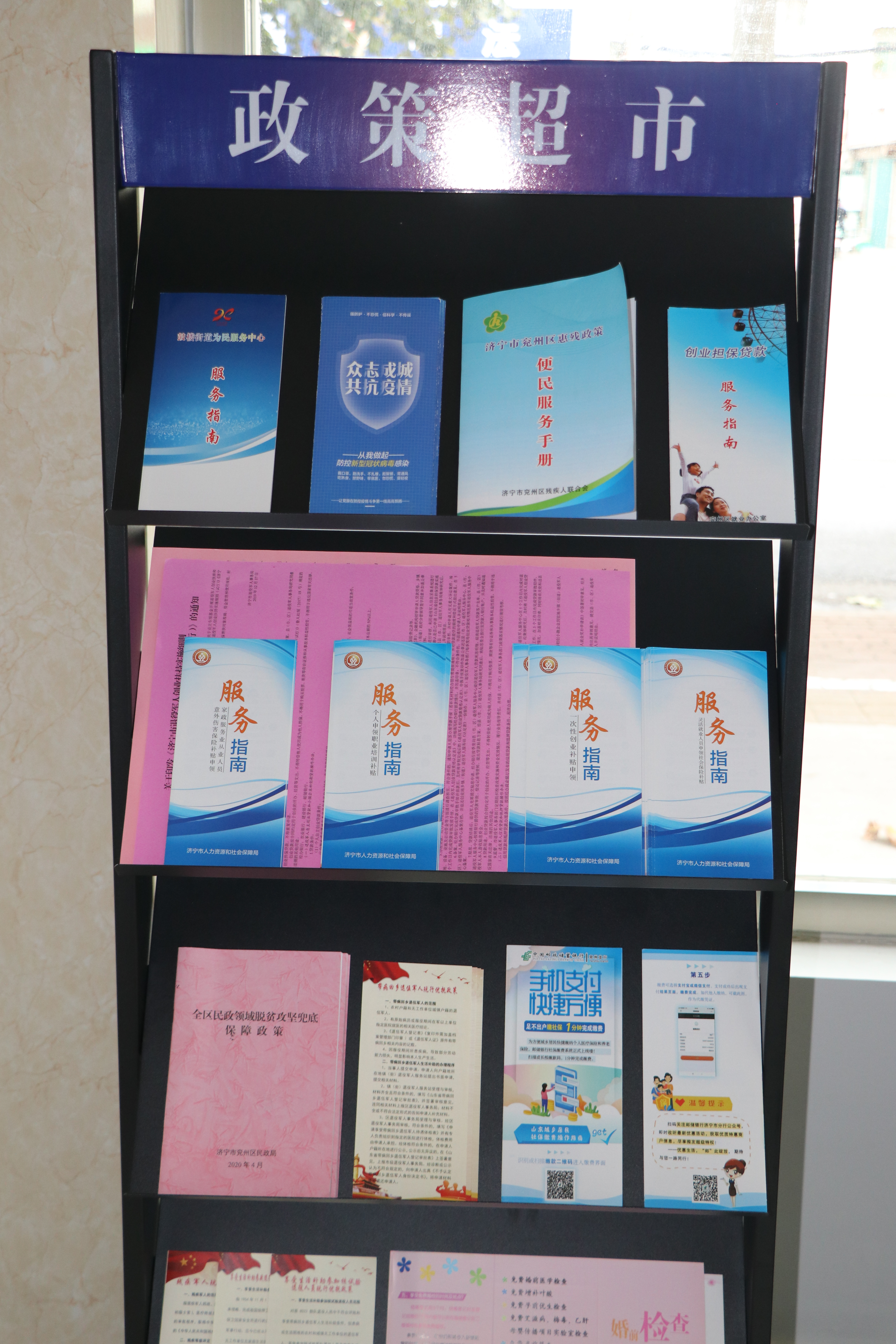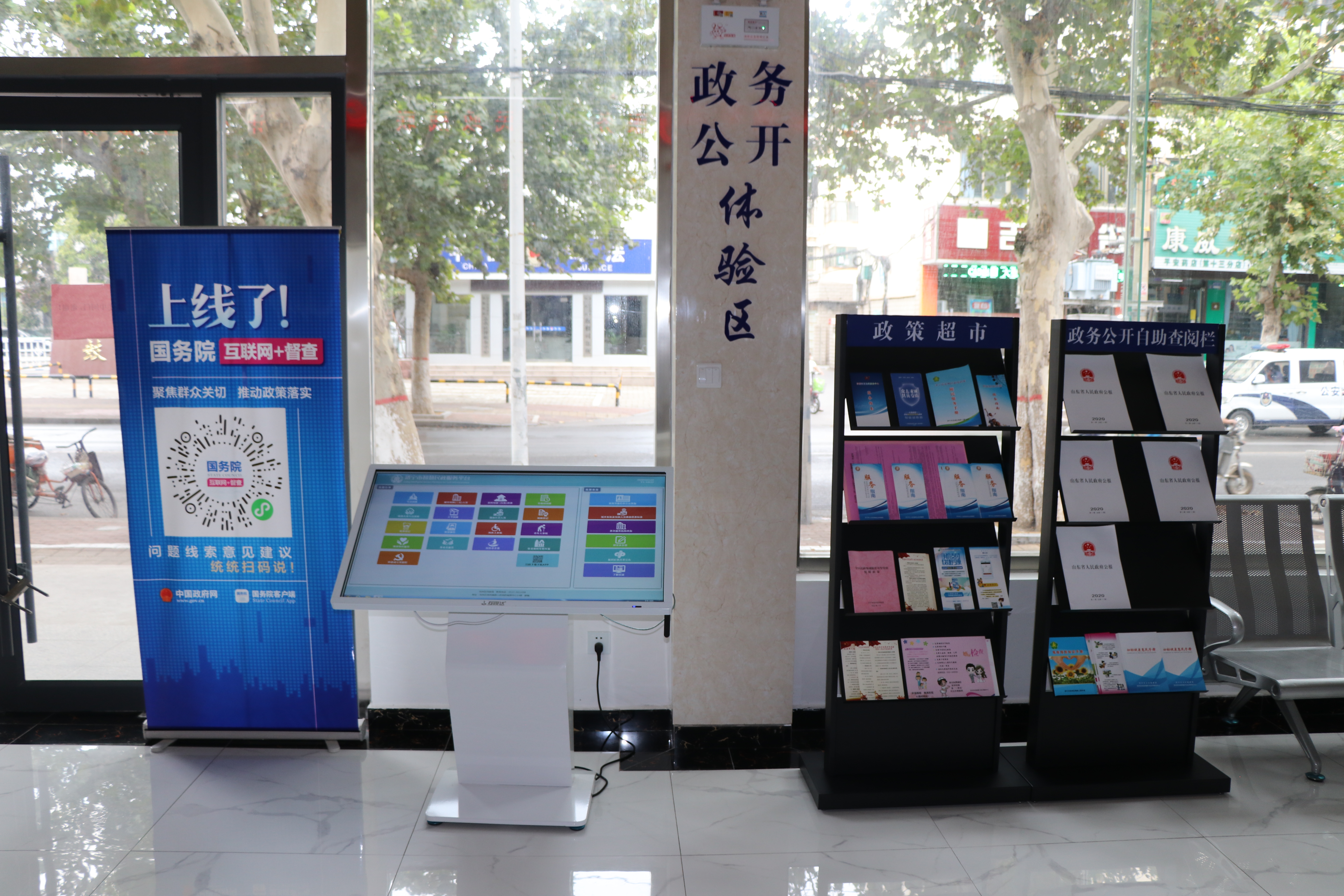 二是信息资源集中化。体验区设置了“政策超市”“政务公开自助查阅栏”,并在大厅入口处放置了陈列架,将近期予以公开的资料进行陈列,供有需求的群众进行阅览。陈列内容将着重公开群众关注度较高的服务指南、办事手册、政策文件等重要政务信息,并定期、集约向公众补充投放。