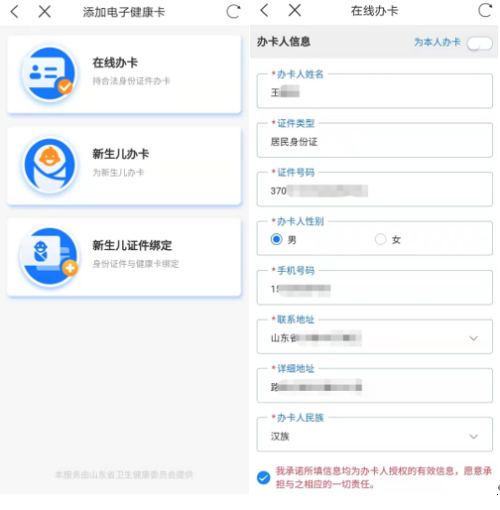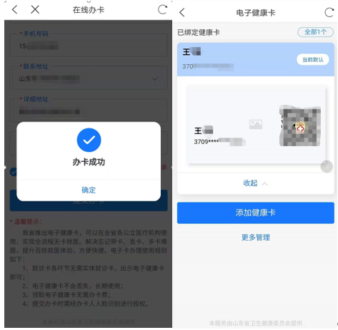 与传统医院就诊卡相比,“电子健康卡”借助跨医疗机构的诊疗服务信息互认共享,根据就诊者身份信息便可在全省各公立医疗机构使用,实现全流程无卡就医。同时,对于无办理能力的老年人、婴幼儿等群体,“爱山东”APP支持为他人在线办卡功能。