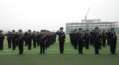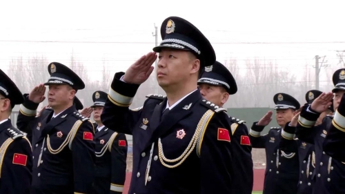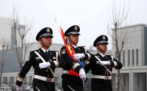 “升警旗,奏人民警察警歌,敬礼!”伴随着雄壮嘹亮的中国人民警察警歌声响起,护旗手挥臂扬旗,象征着人民警察荣誉、责任和使命的警旗徐徐升起。全体民警庄严敬礼,警旗上警徽闪耀,红蓝旗帜迎风飘扬。