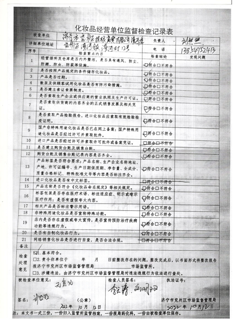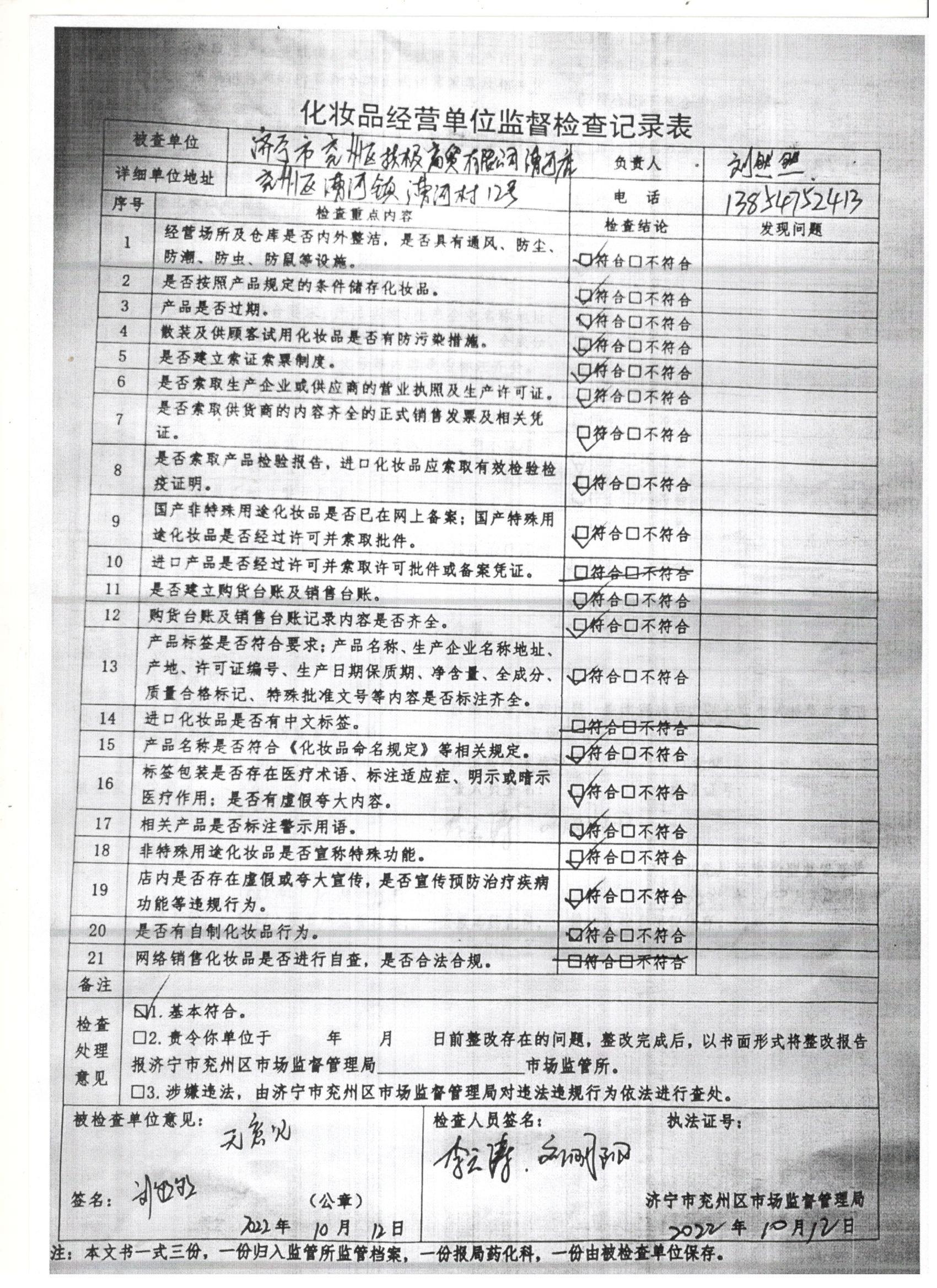 【化妆品经营监督检查结果】济宁市兖州区拱极商贸有限公司漕河店现场检查记录表