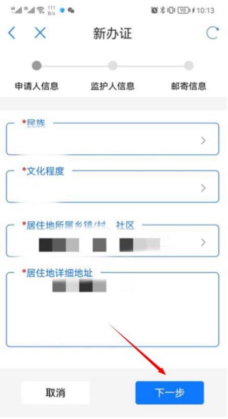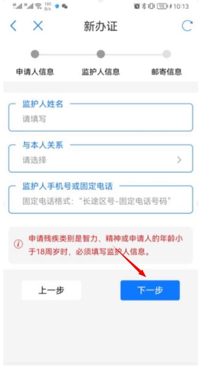 3、申报残疾类型为智力、精神或申请人年龄小于18周岁时,需继续填写监护人相关信息,点击“下一步”;
