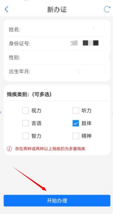 1、点击“新办证”服务进入,勾选残疾类别,并点击“开始办理”;