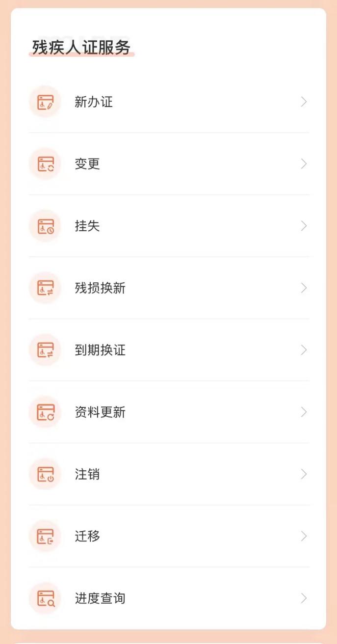 该模块支持残疾人证九大服务事项在线办理,包含新办证、变更、挂失、残损换新、到期换证、资料更新、注销、迁移及进度查询。