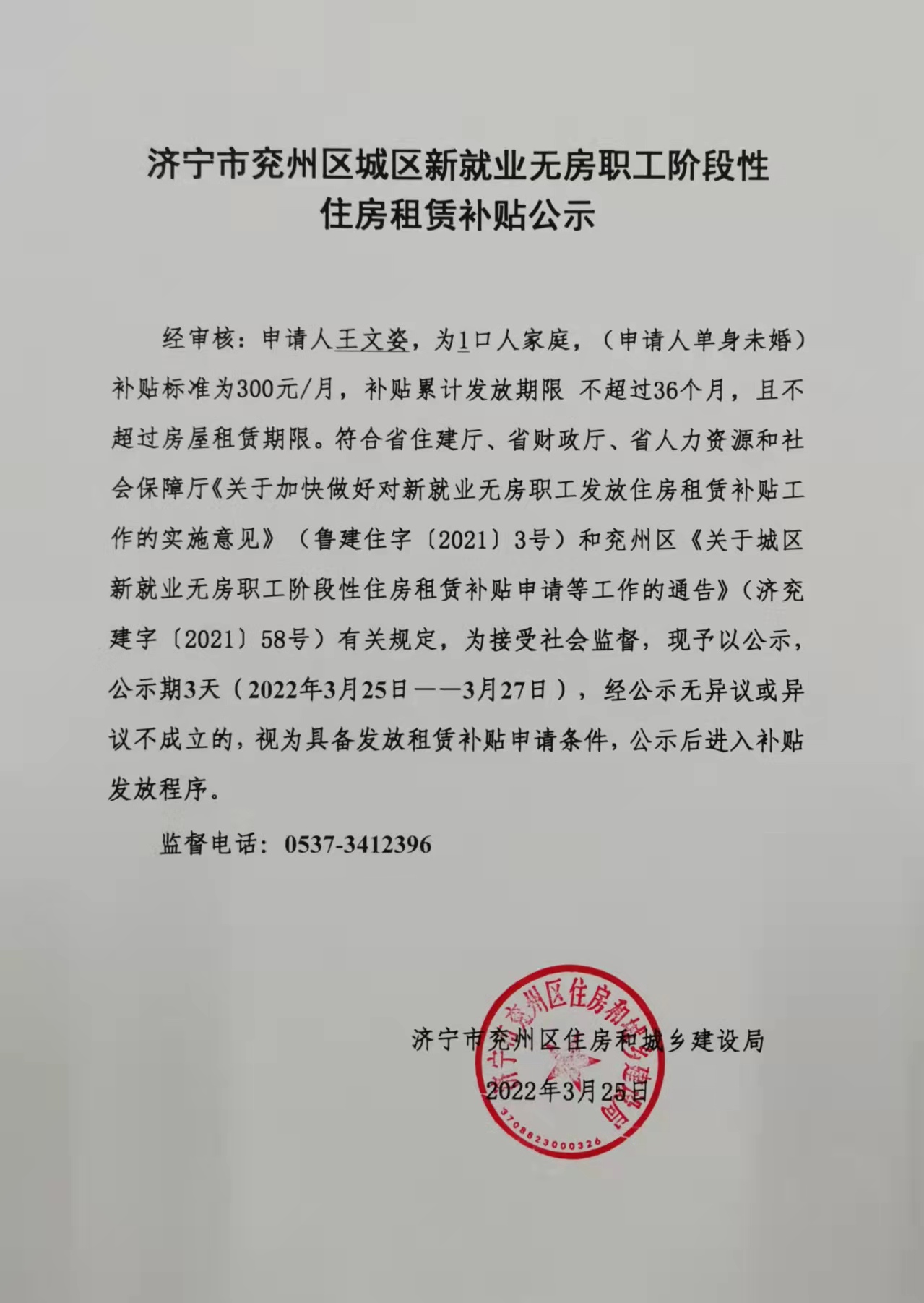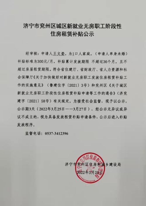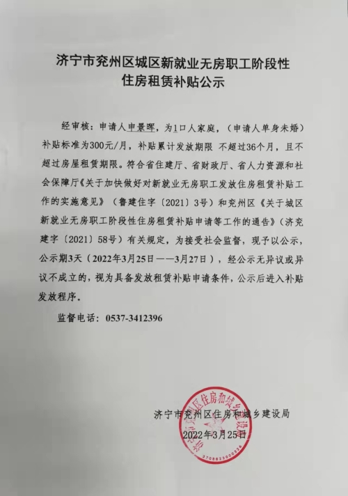 济宁市兖州区城区新就业无房职工阶段性住房租赁补贴公示