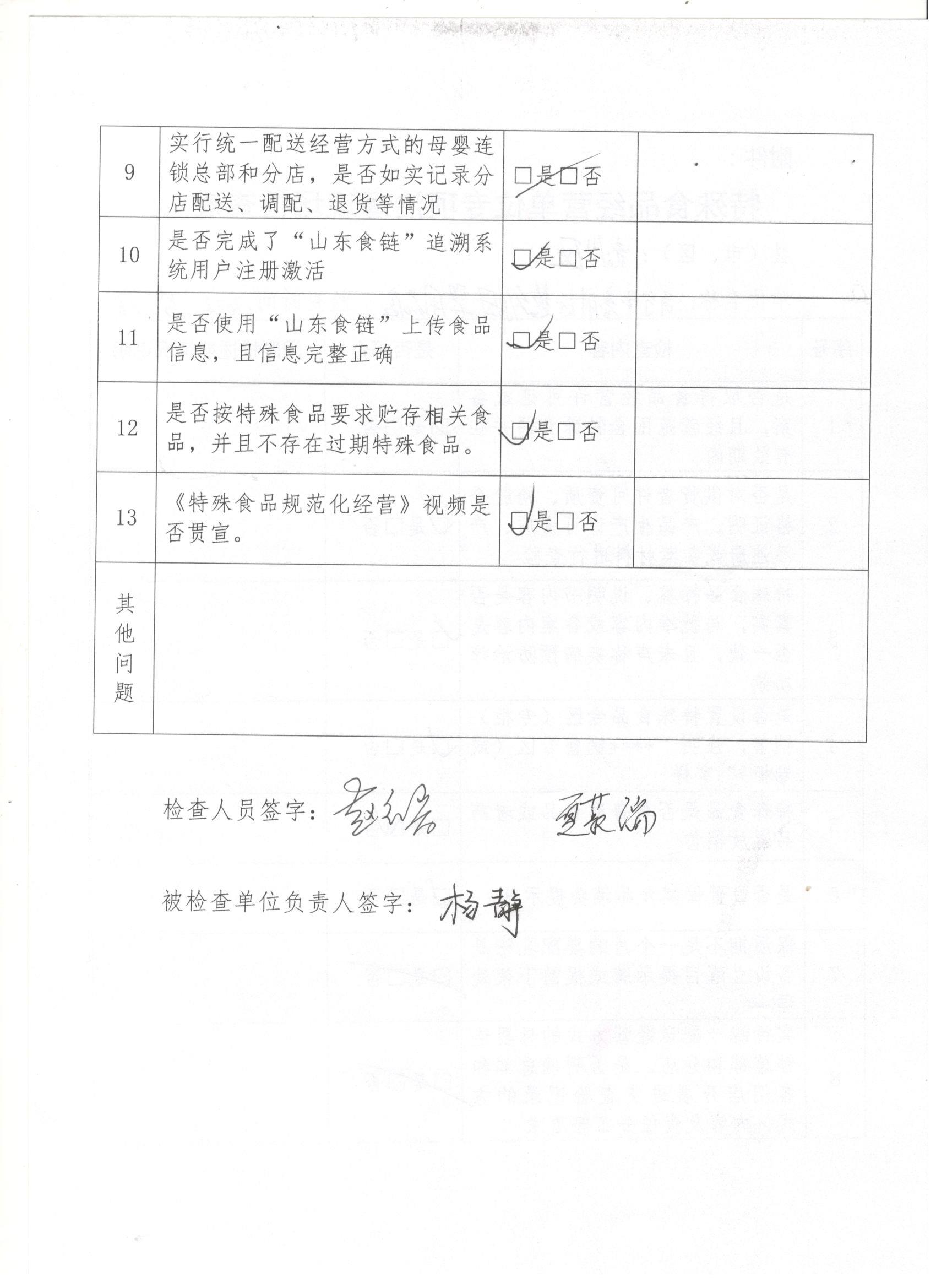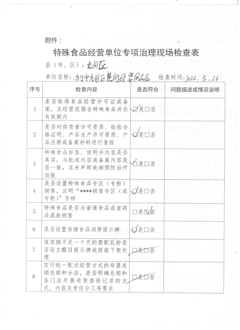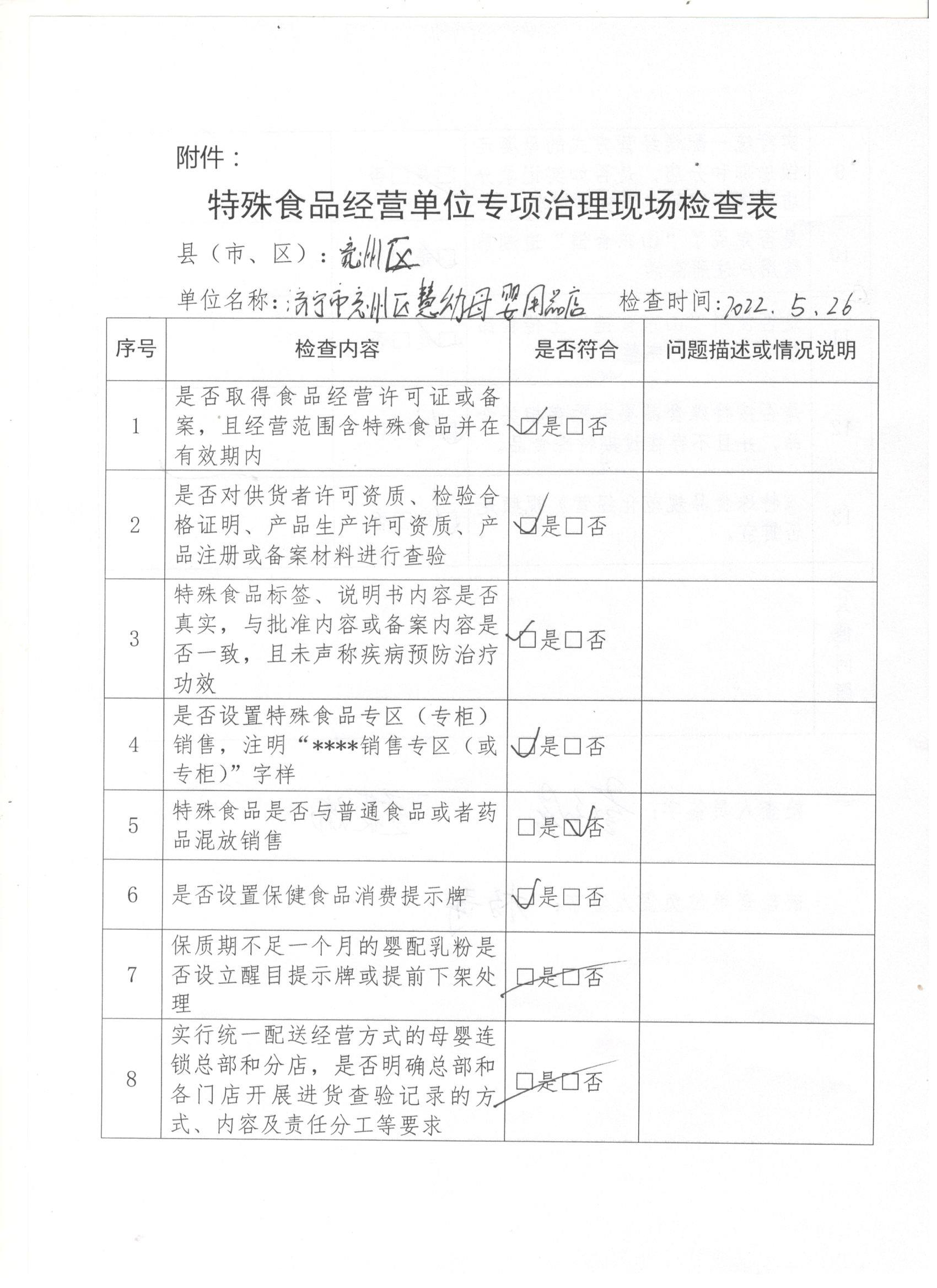 【特殊食品生产经营监督检查结果】济宁市兖州区慧幼母婴用品店检查结果记录表