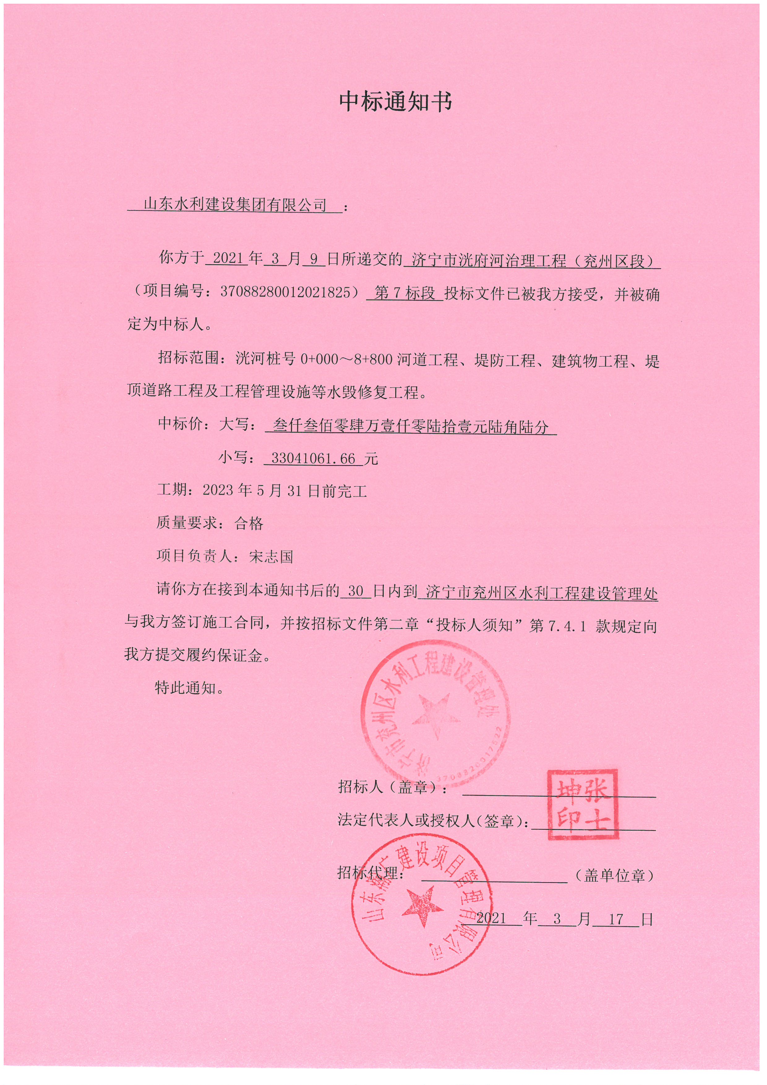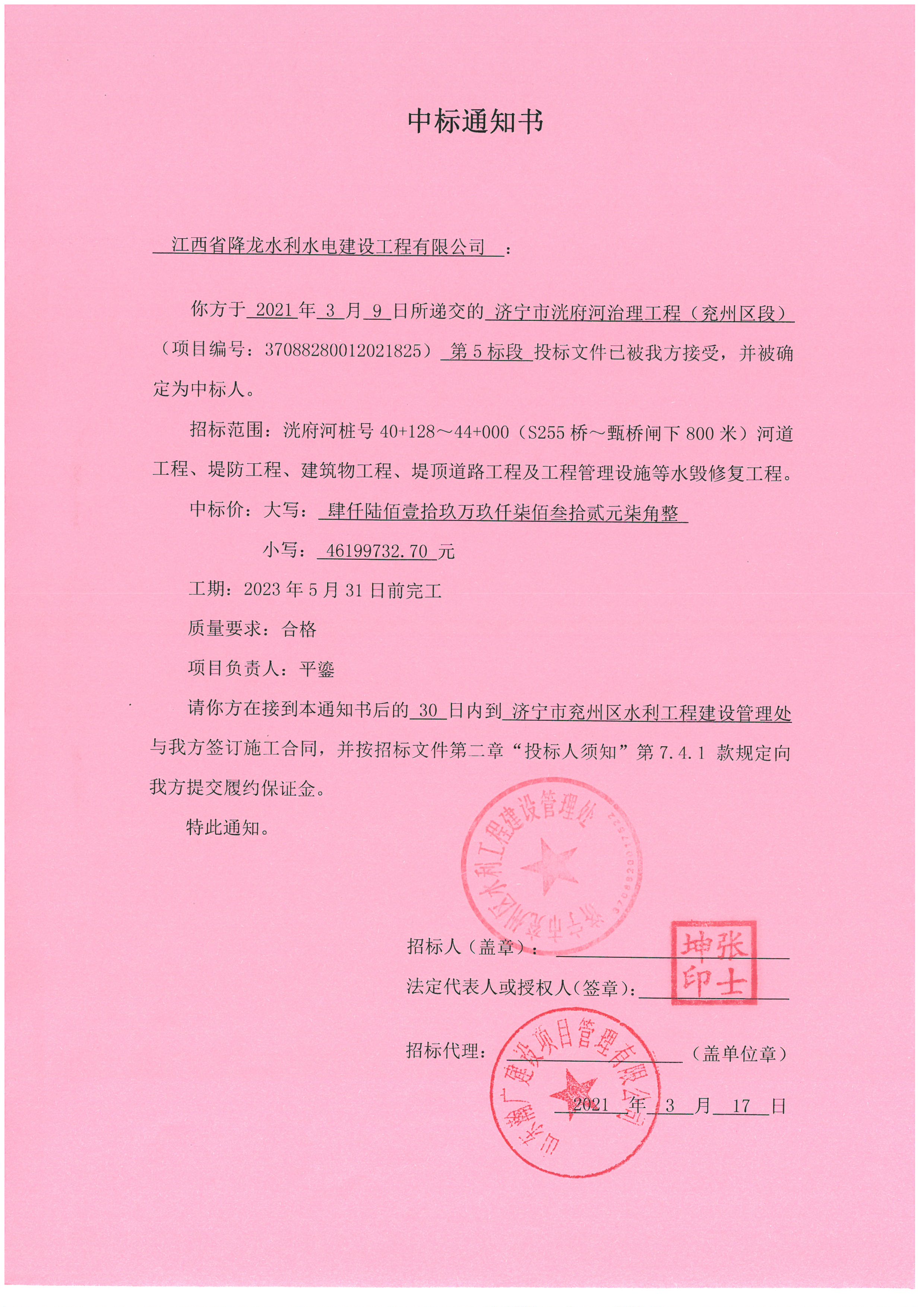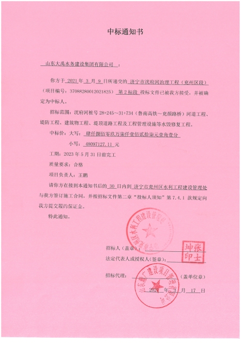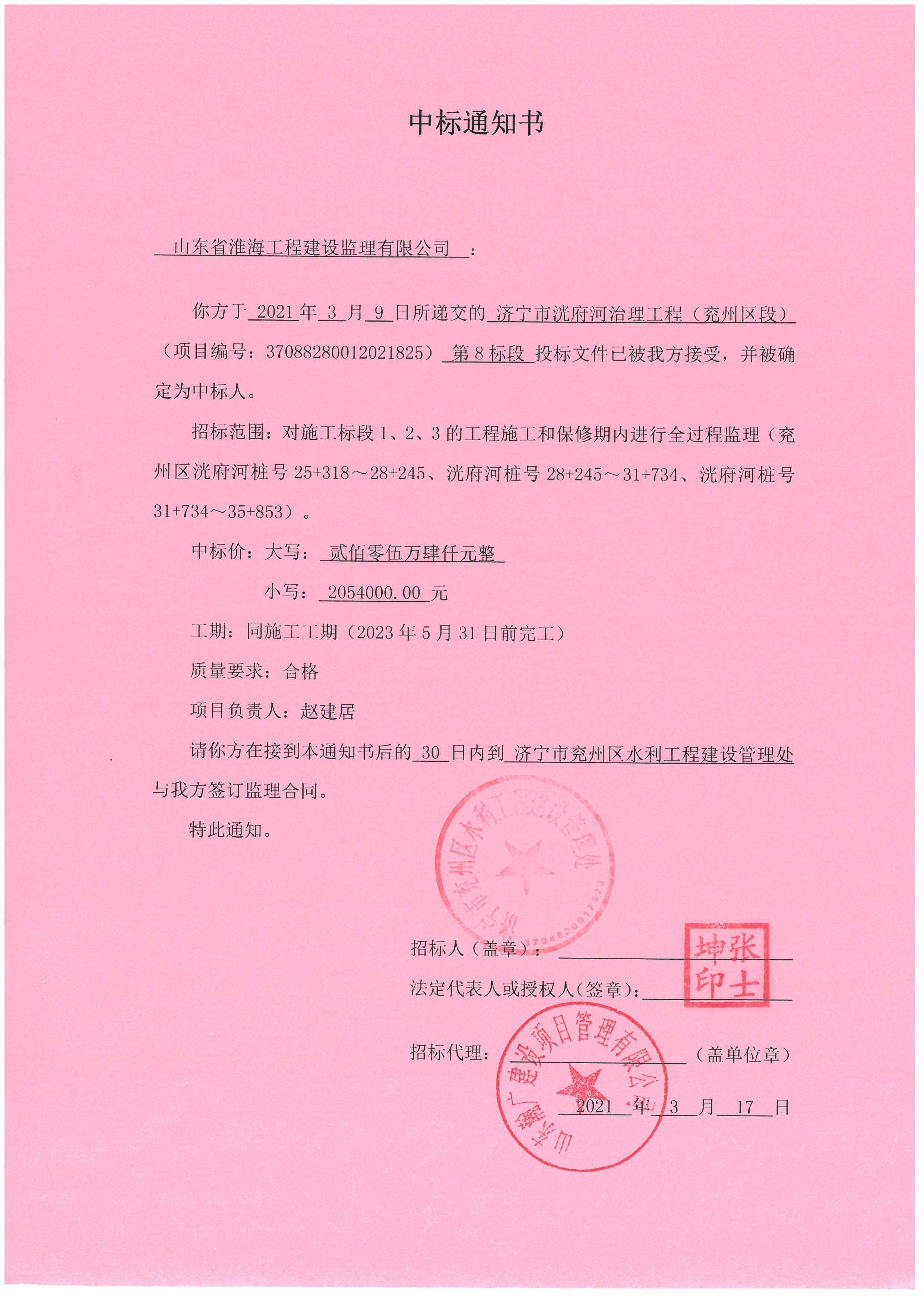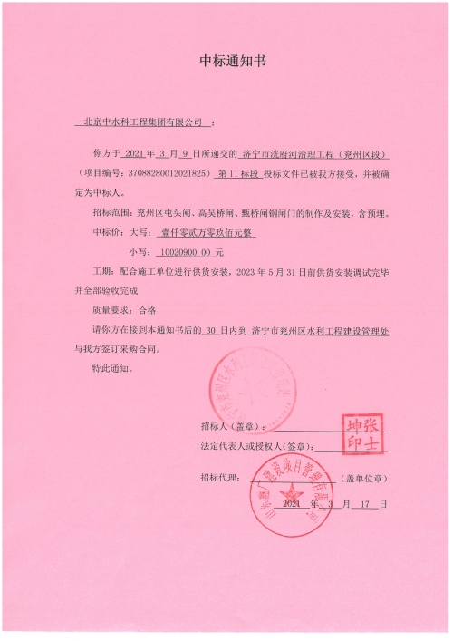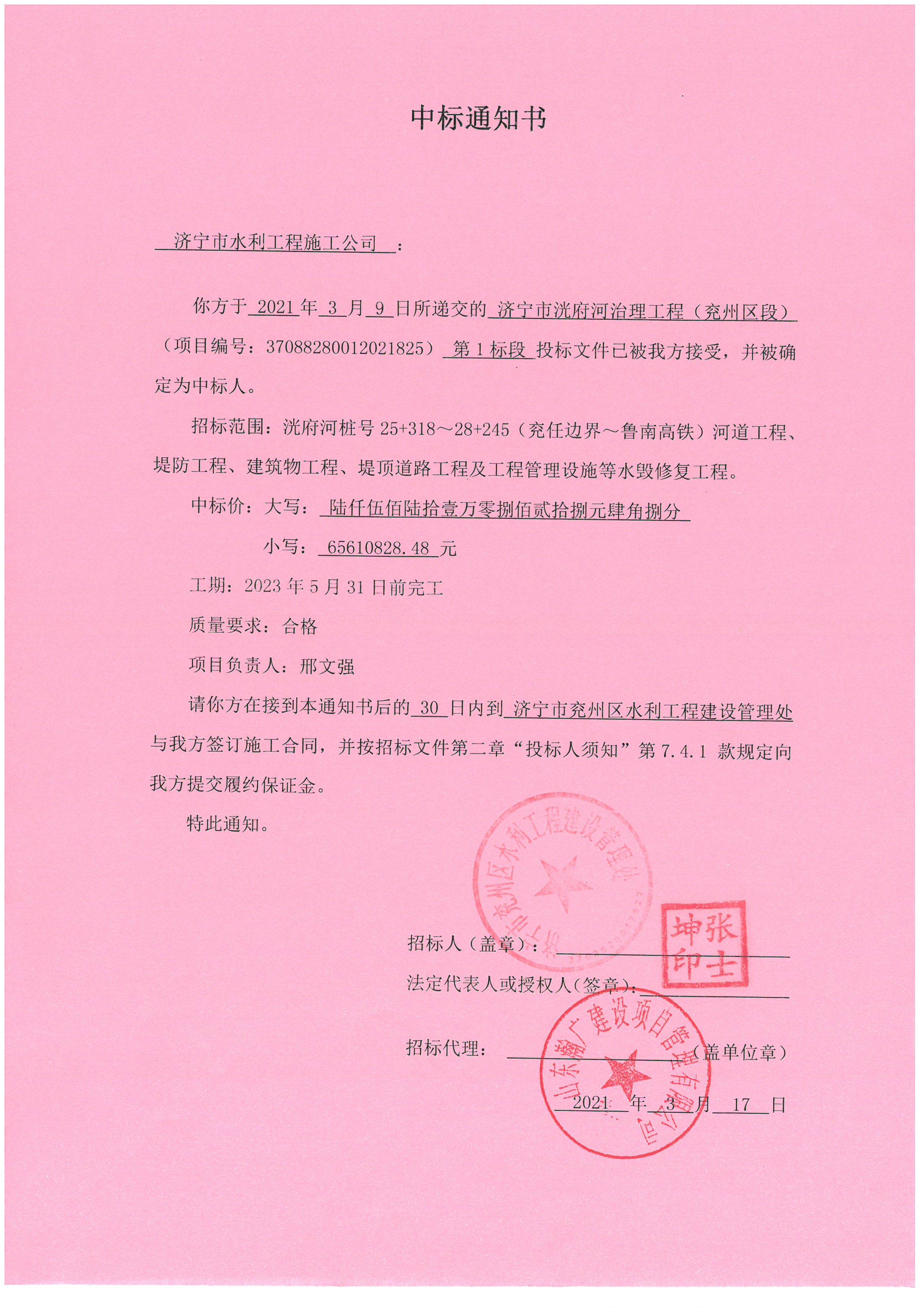 【济宁市洸府河治理工程(兖州区段)】中标通知书