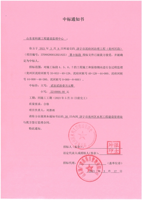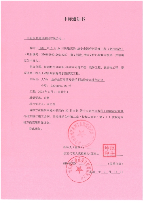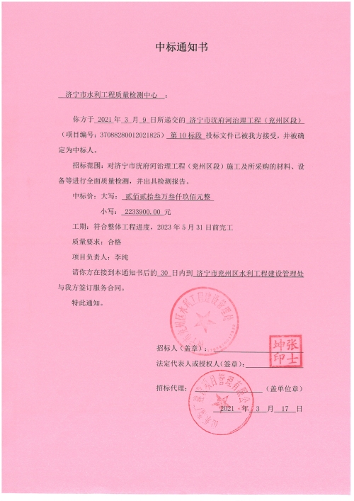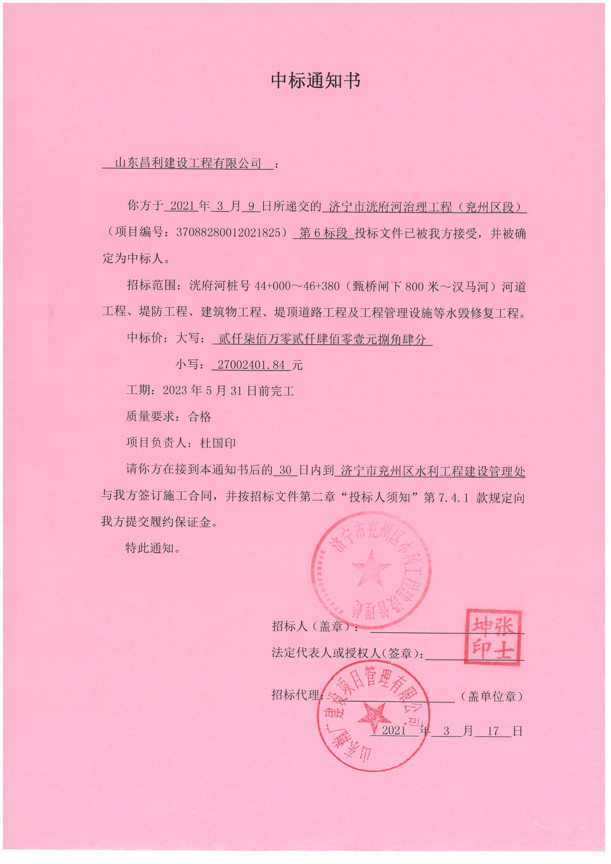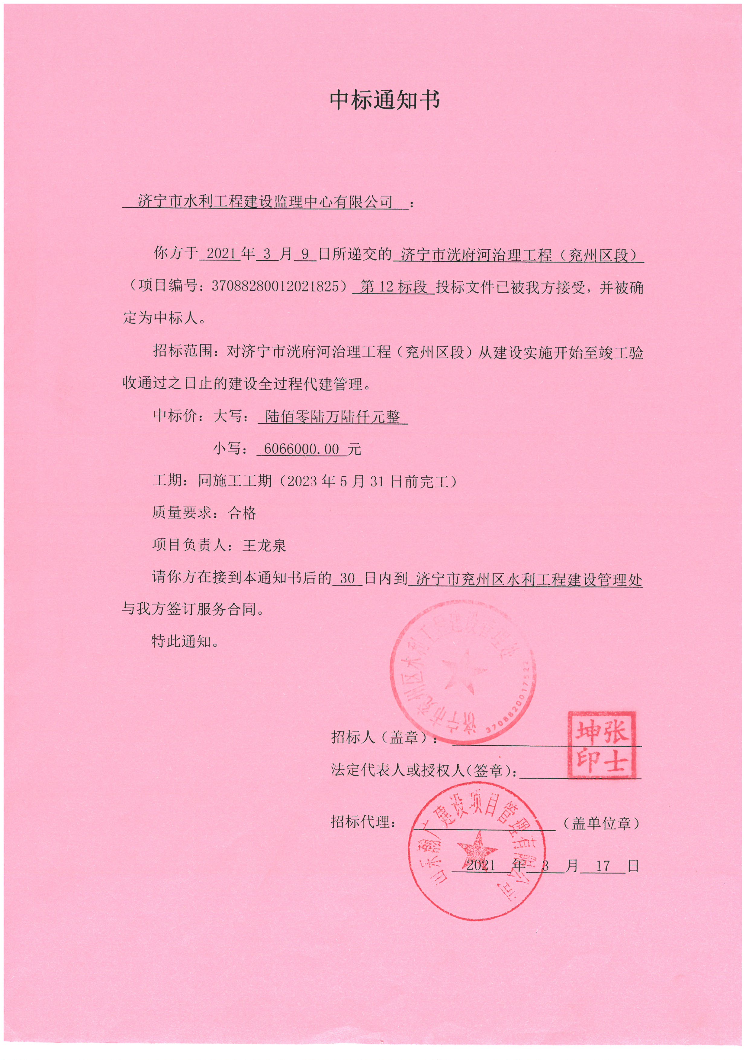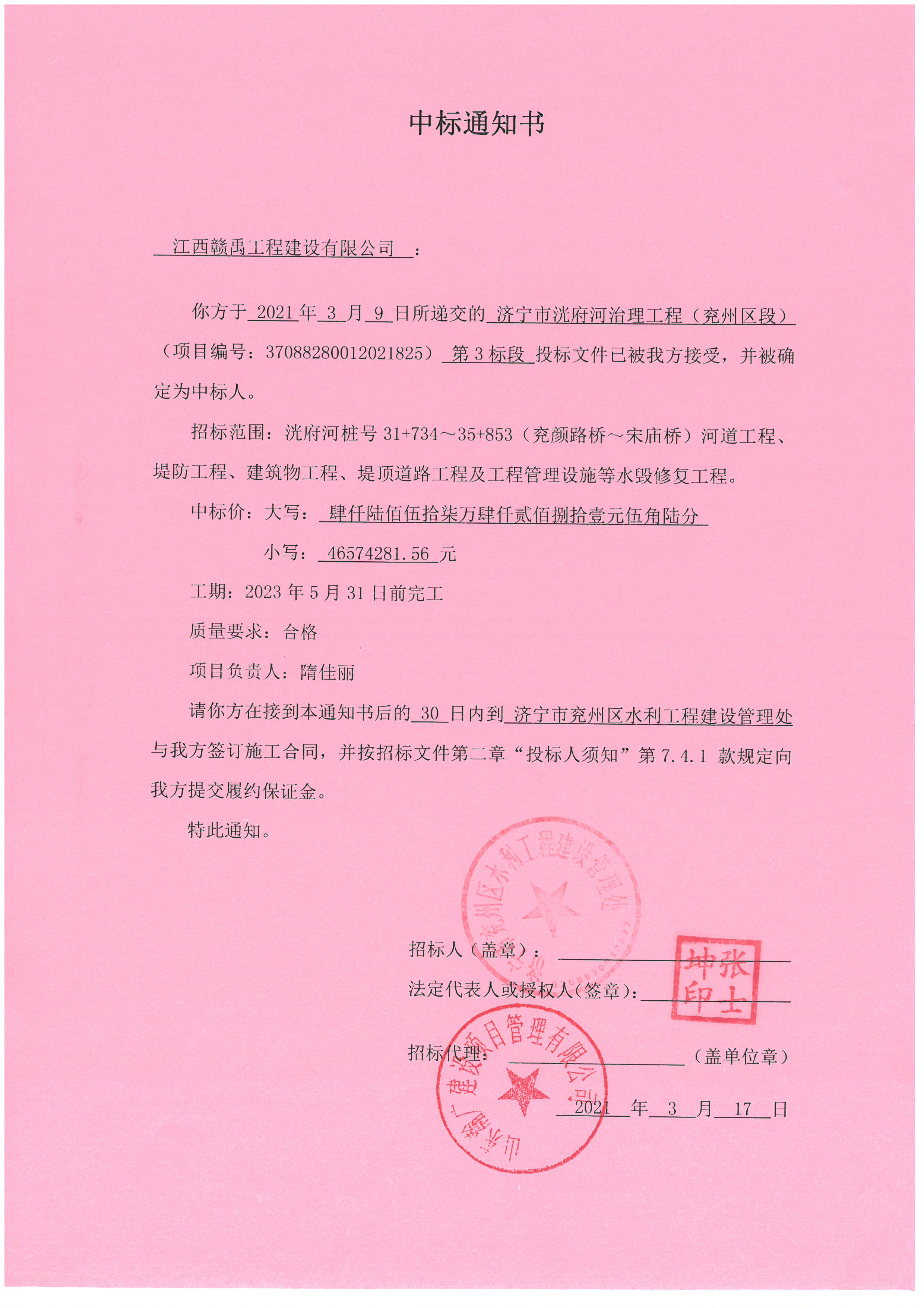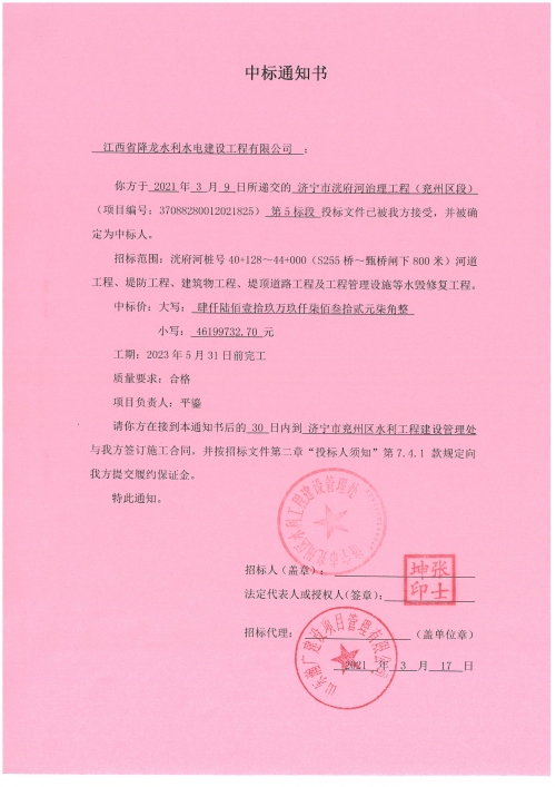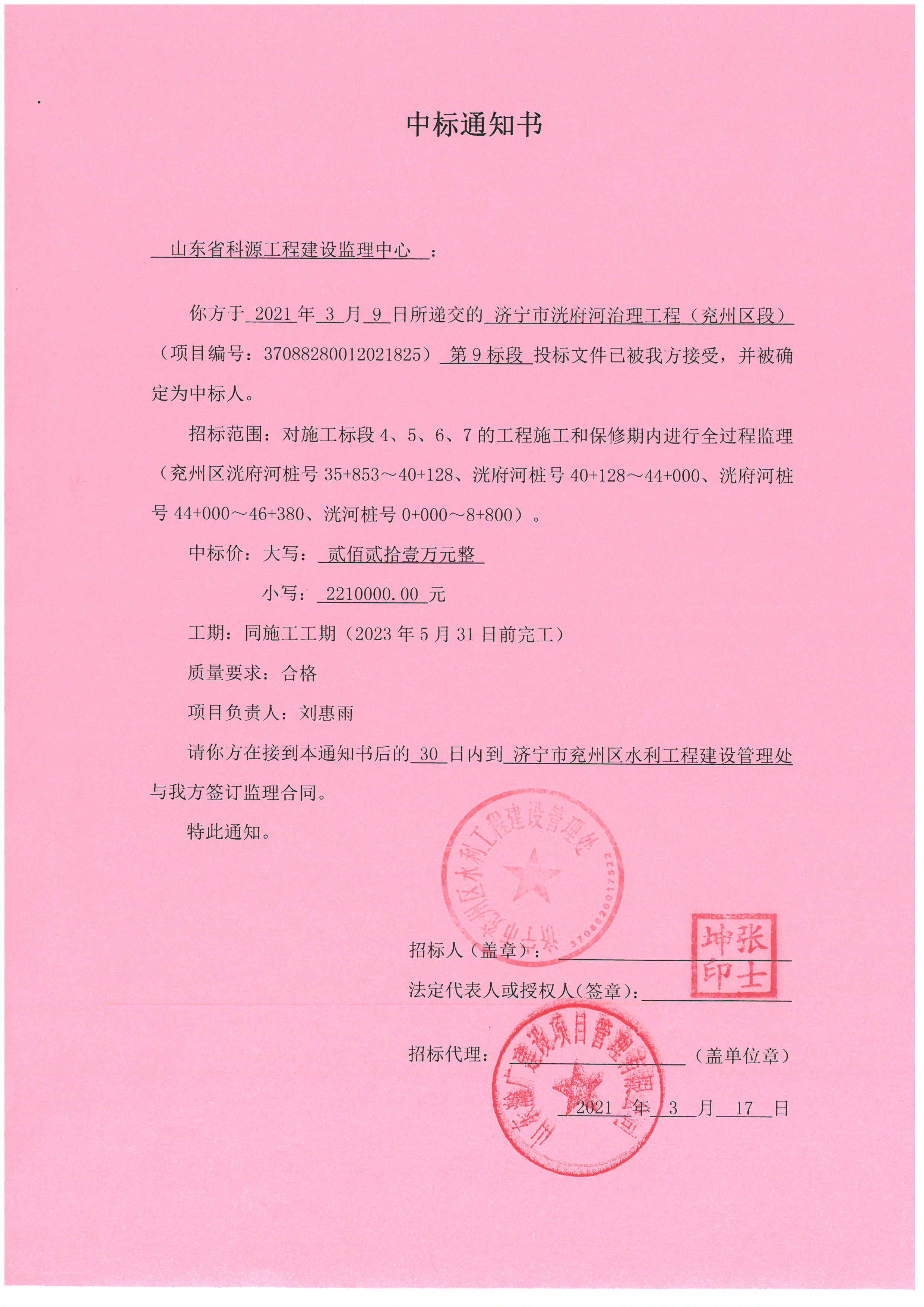 【济宁市洸府河治理工程(兖州区段)】中标通知书