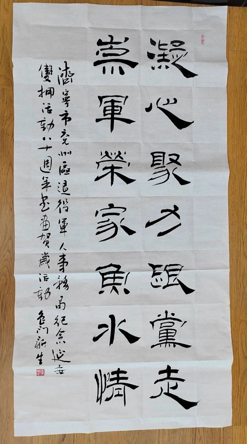 “老兵书法家亲笔手写的春联就是不一样,不仅让年味更浓,还可以满足‘私人订制’各种寓意吉祥春联的需求,太赞了!”一名在现场的军休干部拿着刚刚写好的春联,喜悦之情溢于言表。活动最后,书法家还专门为本次活动题词——“凝心聚力跟党走 崇军荣家鱼水情”,以此感谢区退役军人事务局对本次活动的精心组织、用心开展。