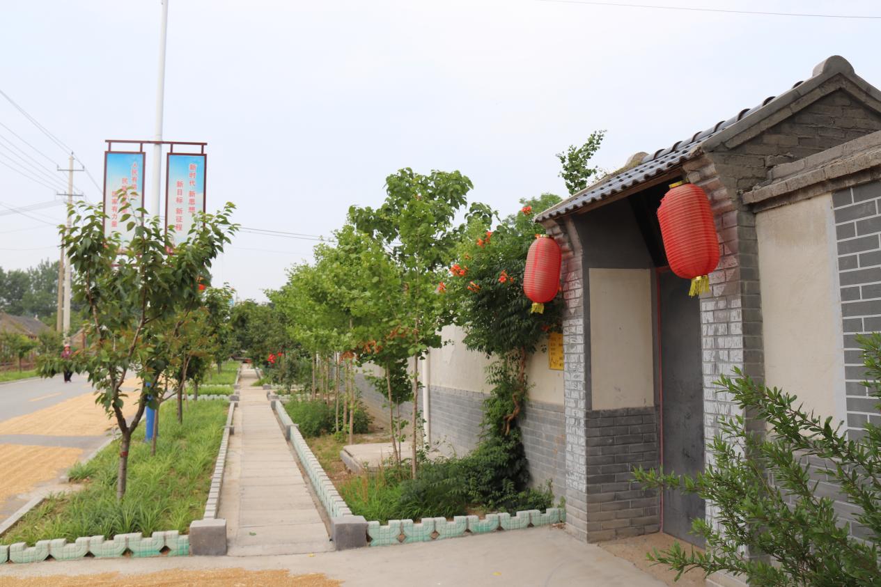 莱西市产芝湖新村白墙灰瓦与大红灯笼、街边绿树构成美丽村景