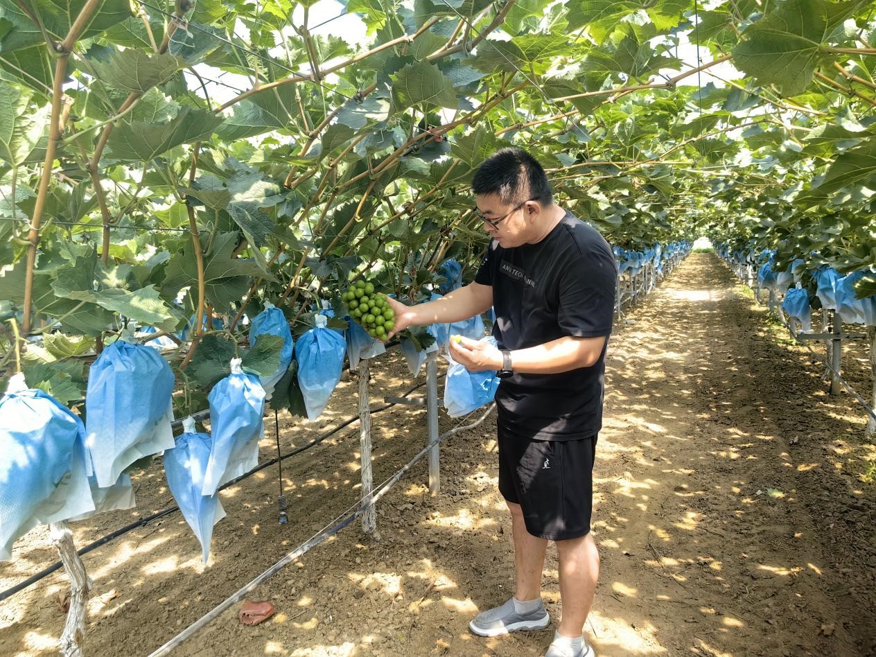 青岛莱西市茂芝场现代设施农业产业园内,村民许浩亮正在摘袋查看葡萄生长情况