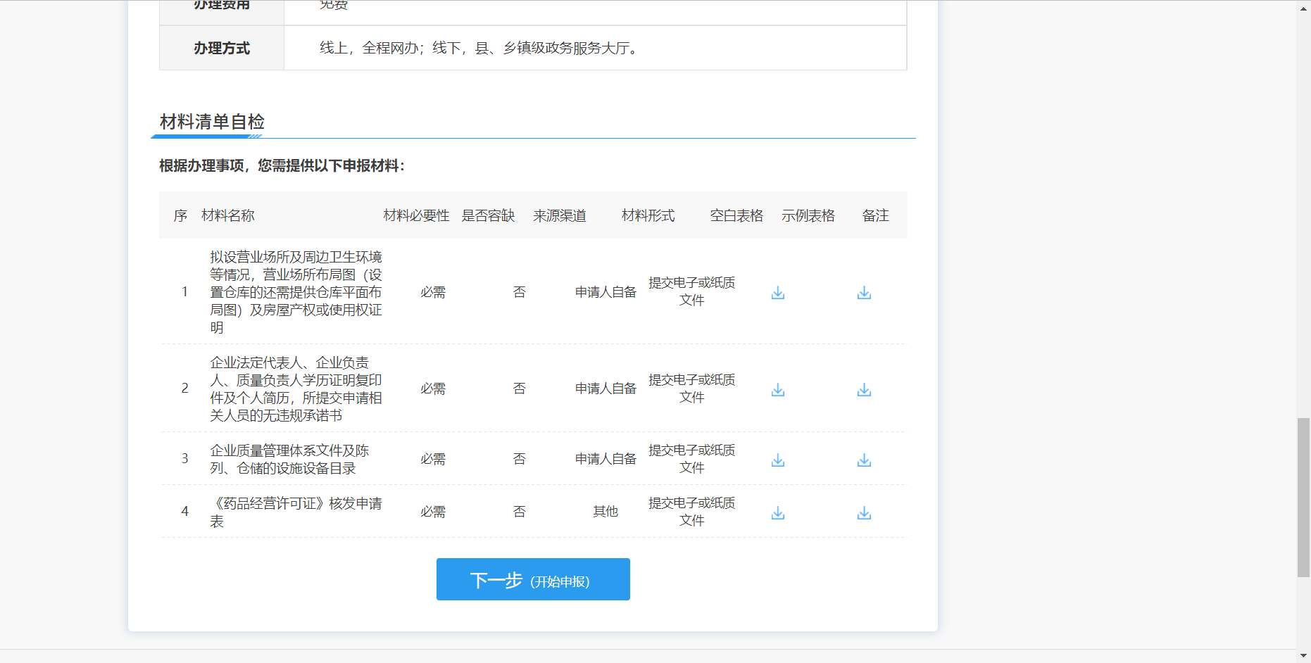 8、情形确认后,展示办事指南和材料清单,点击“下一步”开始申报。