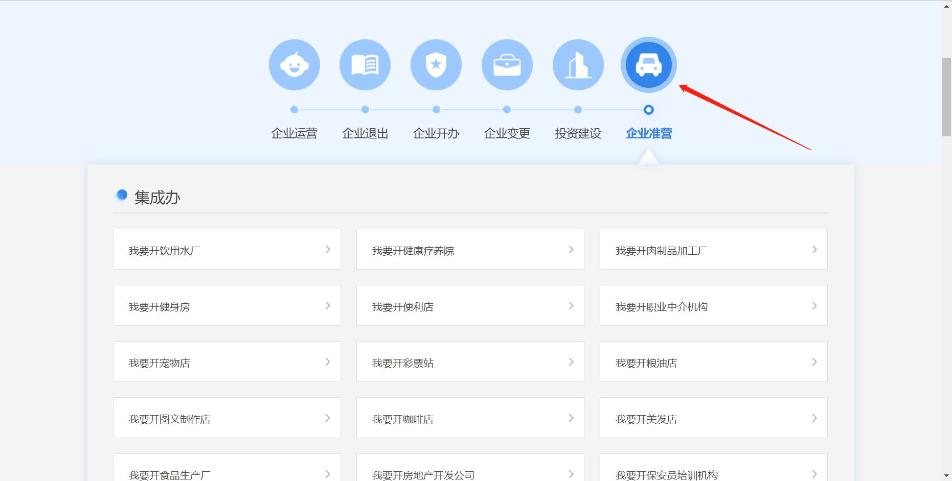 3、选择企业生命全周期,点击企业准营,选择我要开药店。