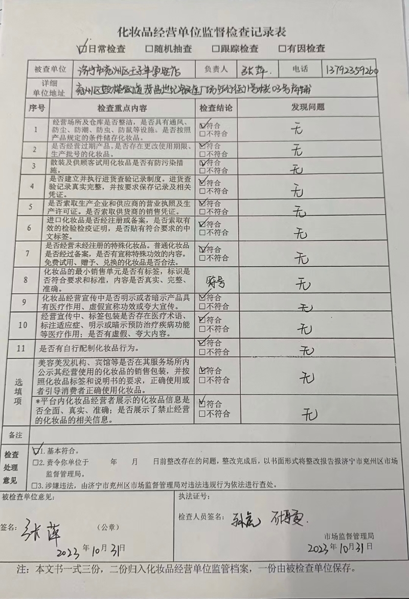 【化妆品经营监督检查结果】济宁市兖州区王子羊孕婴店监督检查记录表