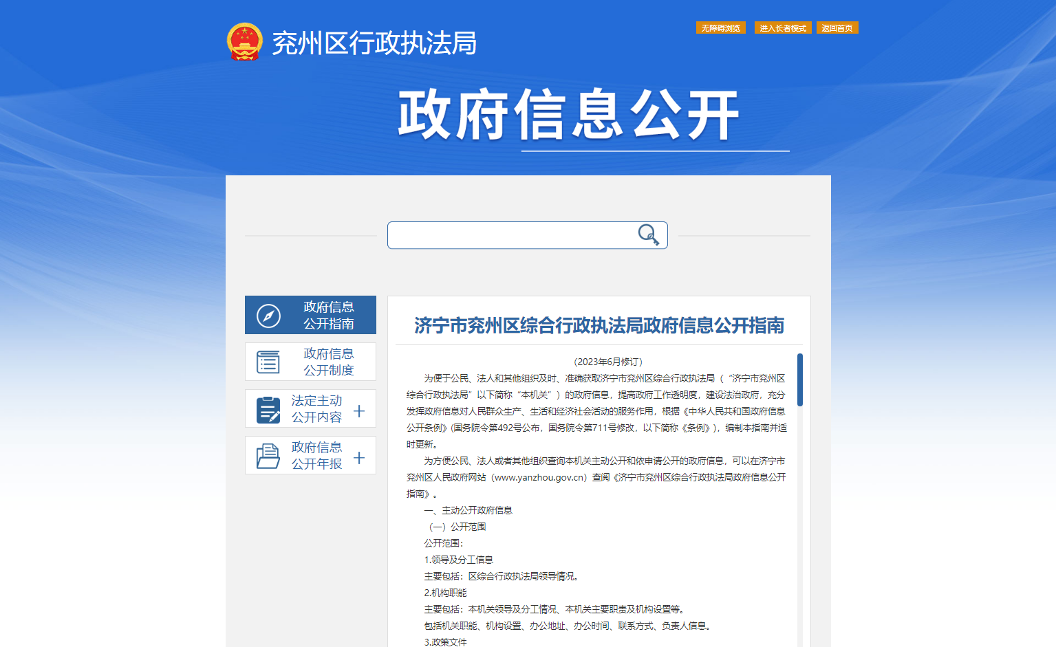 按照市、区两级政务公开工作的要求,结合实际,对政务信息全面梳理,修订完善了《兖州区综合行政执法局信息公开指南》,通过政府信息公开门户网站等途径予以公开。以政府信息公开门户网站为信息公开的主阵地,严格按要求在法定时限内及时主动公开行政许可类、行政处罚类“双公示”信息,便于广大群众对相关事宜提出咨询。