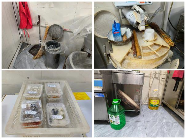 上榜理由:操作间内卫生脏乱差,设施设备未定期清理,加工用具未定位摆放,食品留样不规范,食品原料未离地存放。