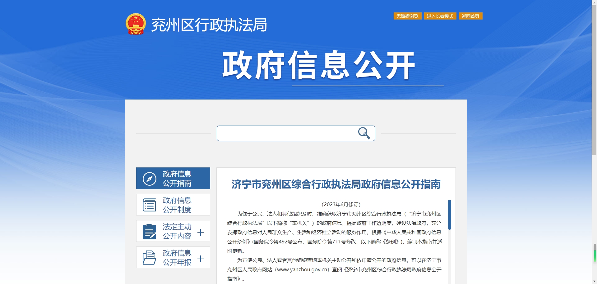 细化明晰各科室、大队的工作责任和任务,进一步强化对信息公开的责任意识、大局意识、服务意识,确保政府信息公开工作及时、准确,切实做到思想上高度重视,职责任务上抓实抓细。按照市、区两级政务公开工作的要求,结合实际,全面梳理政务信息,修订完善了《兖州区综合行政执法局信息公开指南》,通过政府信息公开门户网站等途径予以公开;以政府信息公开门户网站为信息公开的主阵地,严格按要求在法定时限内及时主动公开行政许可类、行政处罚类“双公示”信息,便于广大群众对相关事宜提出咨询。