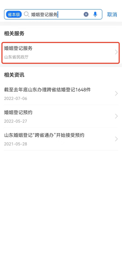 1、打开“爱山东”APP或微信、支付宝小程序,首页搜索“婚姻登记服务”,点击进入;