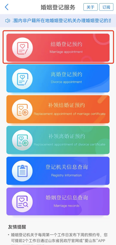 “爱山东”温馨提醒:2月14日情人节结婚登记现已陆续开放预约,婚姻登记机关单日预约数量有限,计划领证的准新人们,请尽快使用“爱山东”提前预约,预约时间为每个工作日的8:00-17:00。