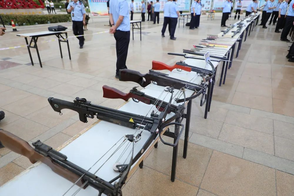在战果展示区,摆放展示了公安分局在执法执勤和案件办理中收缴的刀、枪、弩,通过摆放宣传展板、悬挂横幅、发放宣传资料等形式,向过往的群众讲解枪爆物品管理的法律法规。