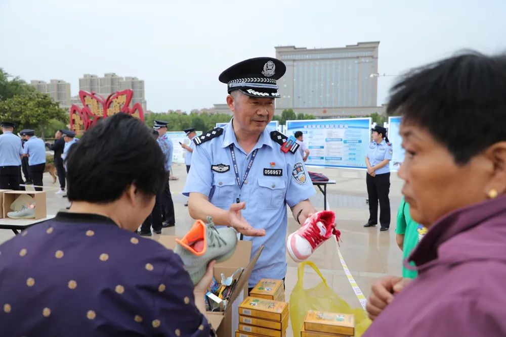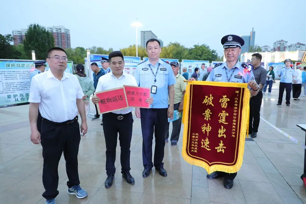 在赃物返还区,兖州公安分局举行了赃款返还仪式,区领导为受害群众发还赃款,受害群众代表向公安分局赠送了锦旗。