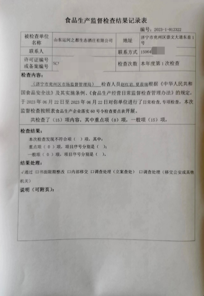 【食品生产经营监督检查结果】山东运河之都生态酒庄有限公司检查结果记录表