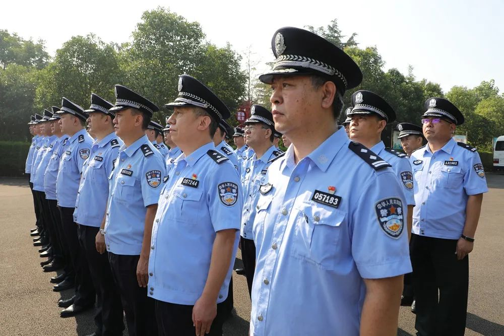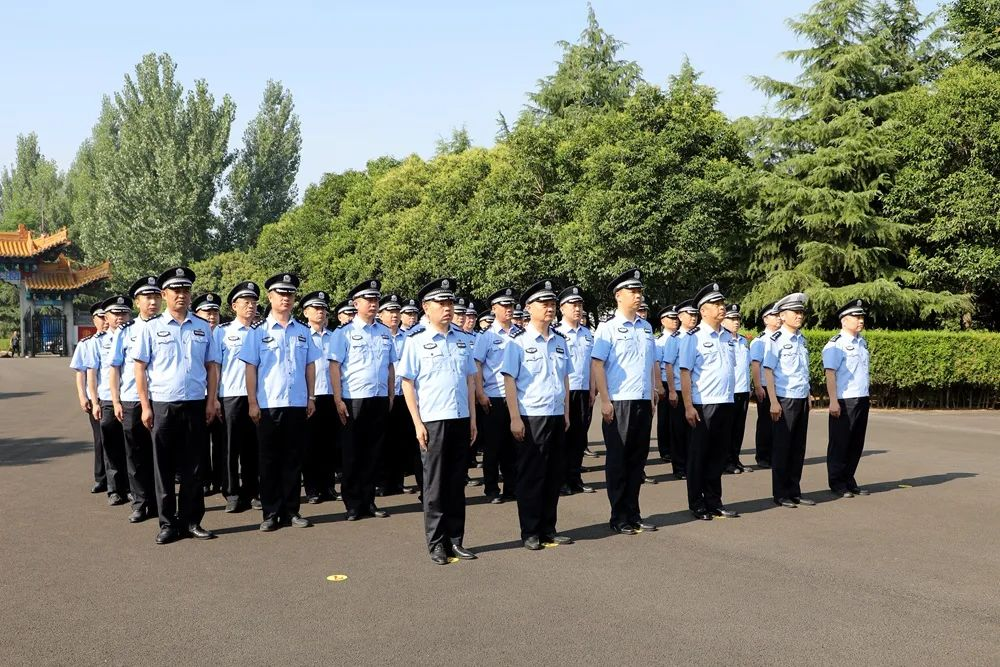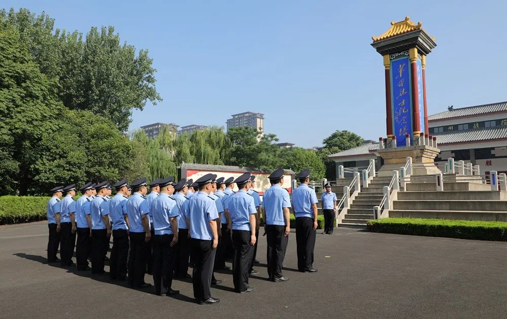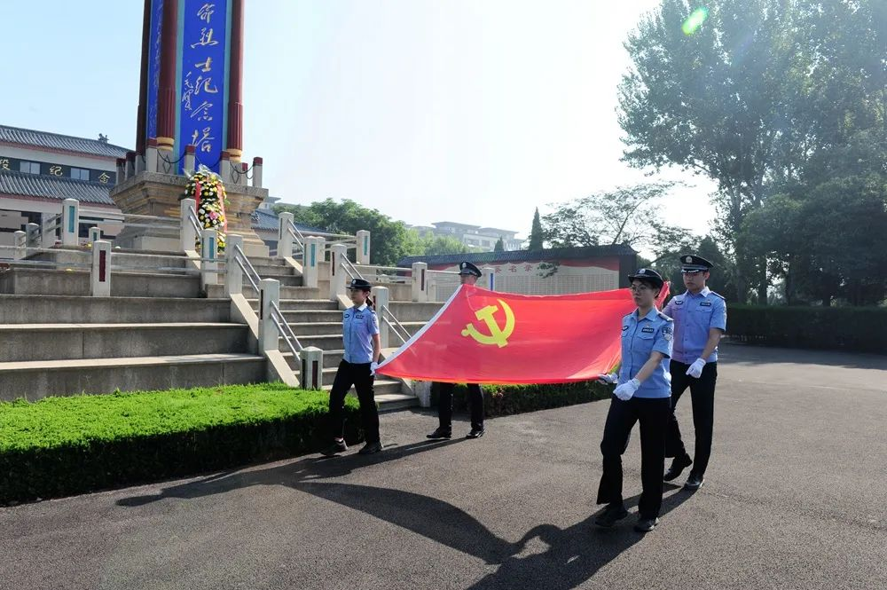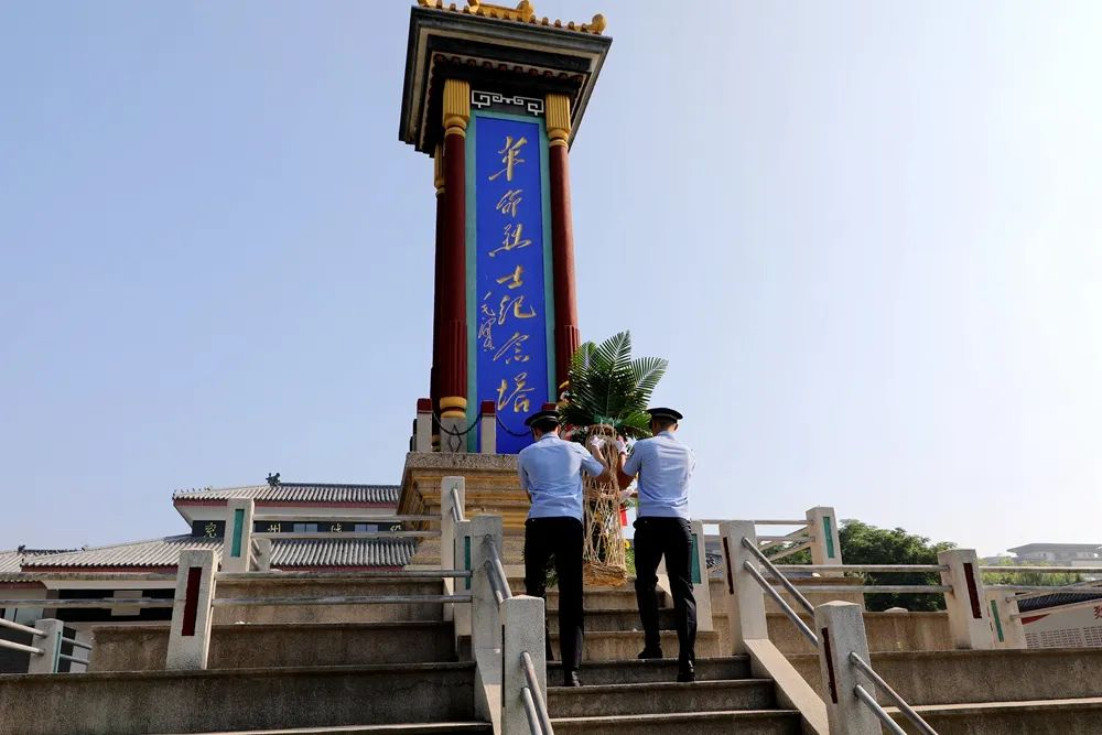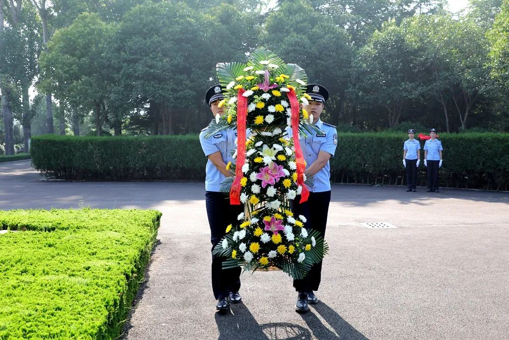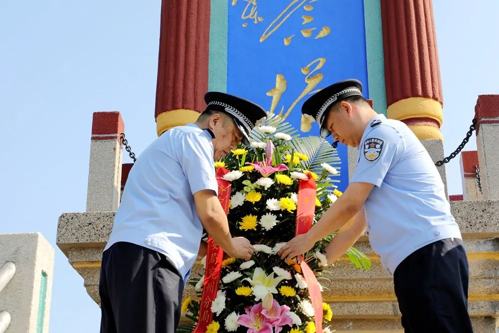 在庄严肃穆的革命烈士纪念塔前,全体党员民警整齐列队,脱帽默哀,敬献花篮,整理缎带,气氛庄重而肃穆,表达对先烈的深切缅怀。