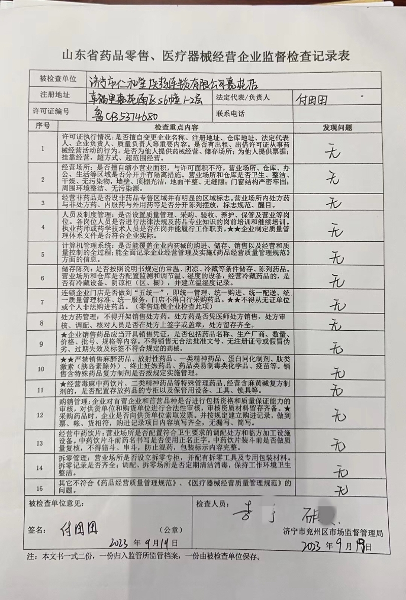 【药品零售监督检查结果】济宁市仁和堂医药连锁有限公司嘉苑店监督检查记录表