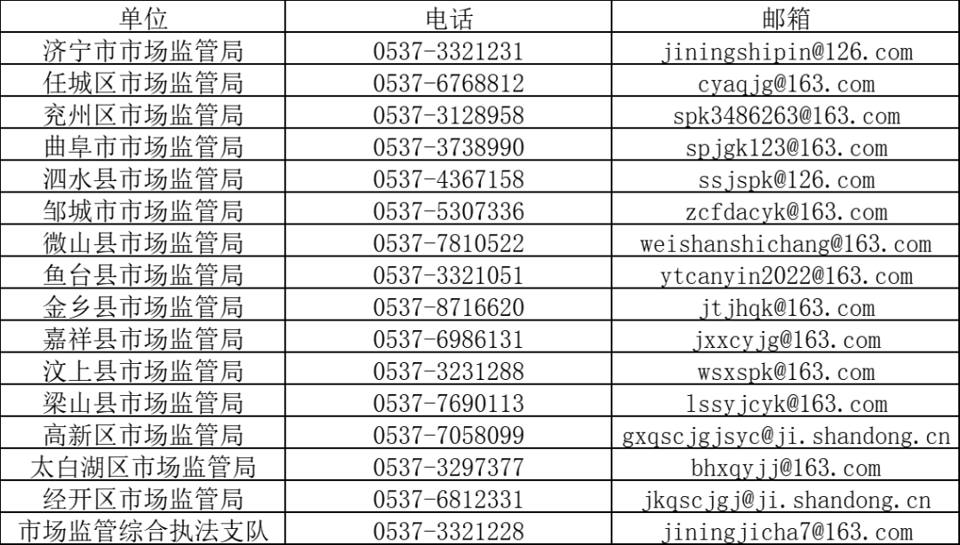 济宁市市场监管部门校园食品安全问题投诉举报电话和邮箱