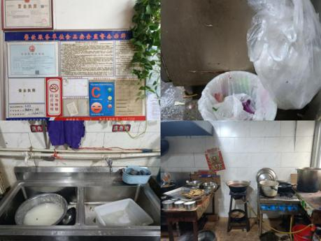 上榜理由:食品安全信息公示不规范,经营场所无反餐饮浪费提醒,操作间内卫生脏乱差,后厨垃圾桶未加盖密闭,食品原材料未离地存放,操作间水池混用,设施设备未定期清理。