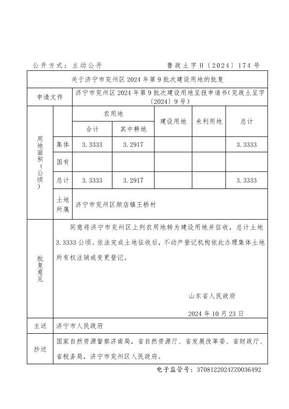 关于济宁市兖州区2024年第9批次建设用地的批复