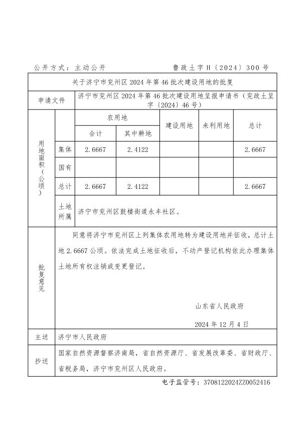 关于济宁市兖州区2024年第46批次建设用地的批复