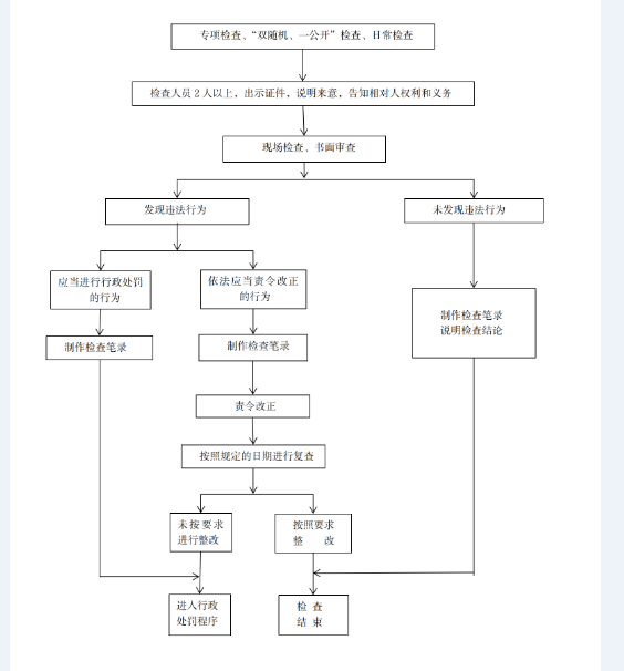 制定检查计划→确定检查对象→现场检查、书面审查→明确是否存在违法行为→制作检查笔录→责令改正→是否进入行政处罚程序→检查结束