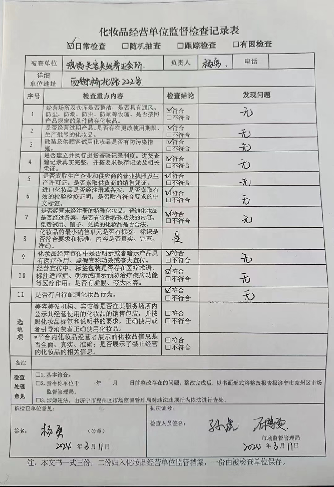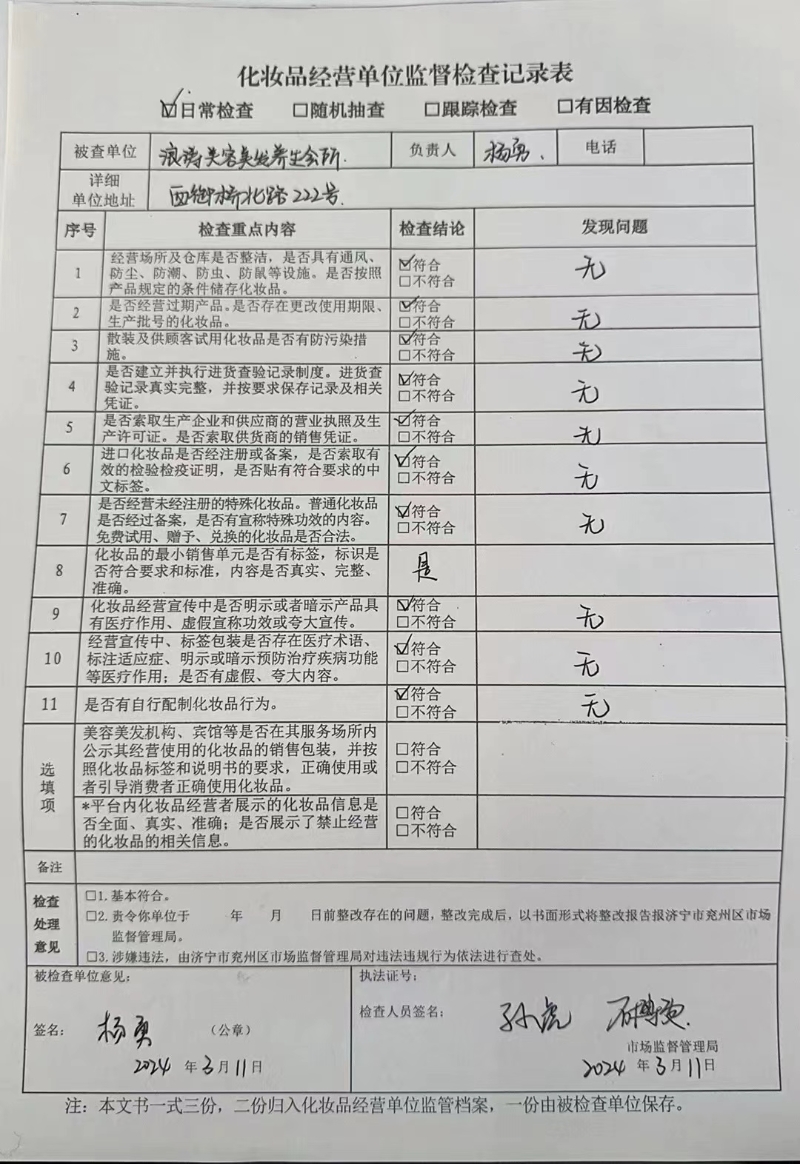 【化妆品经营监督检查结果】浪涛美容美发养生会所检查记录表