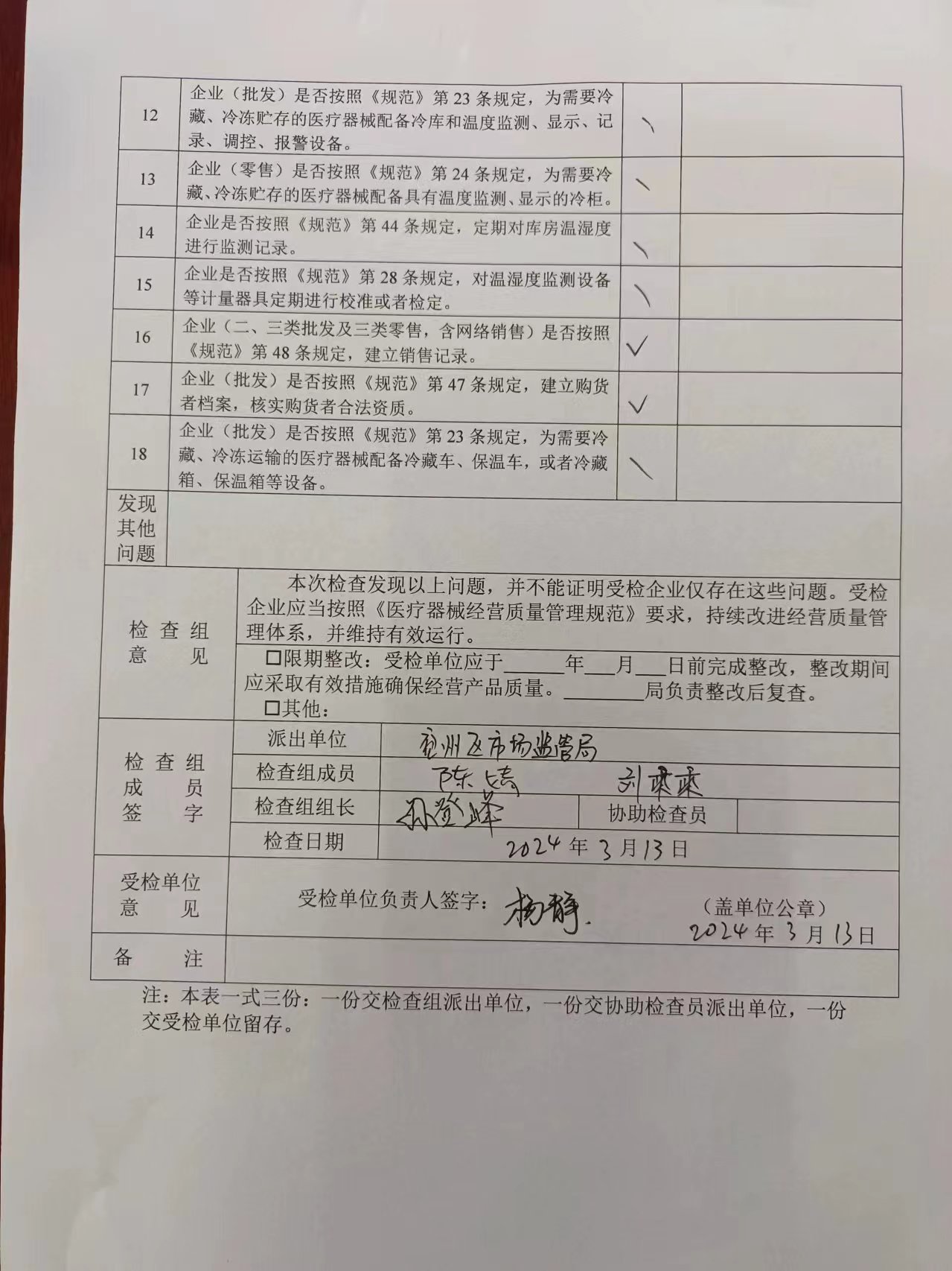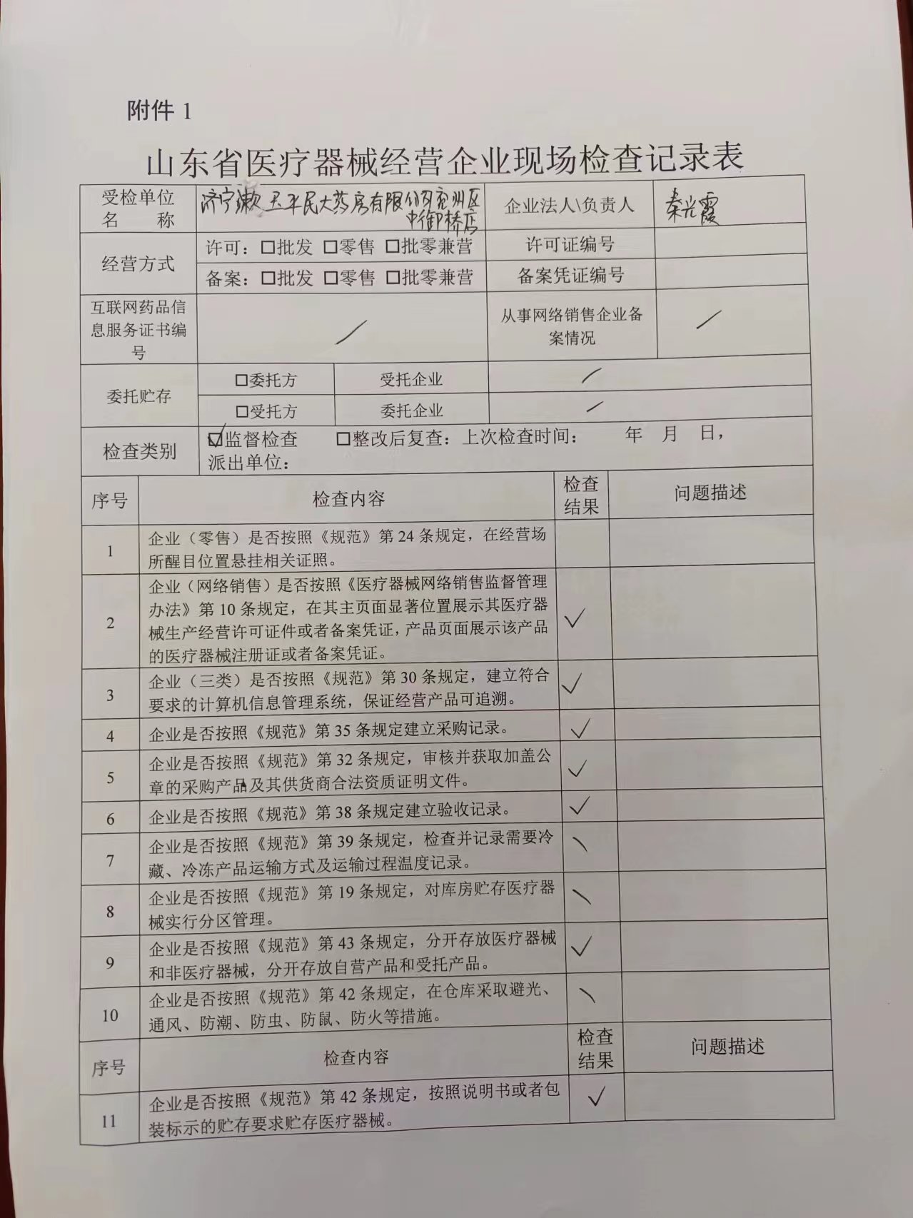 【医疗器械经营监督检查结果】济宁漱玉平民大药房有限公司兖州区中御桥店检查记录表