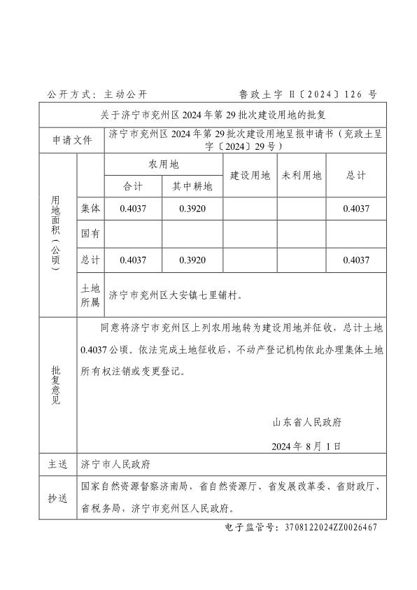 关于济宁市兖州区2024年第29批次建设用地的批复